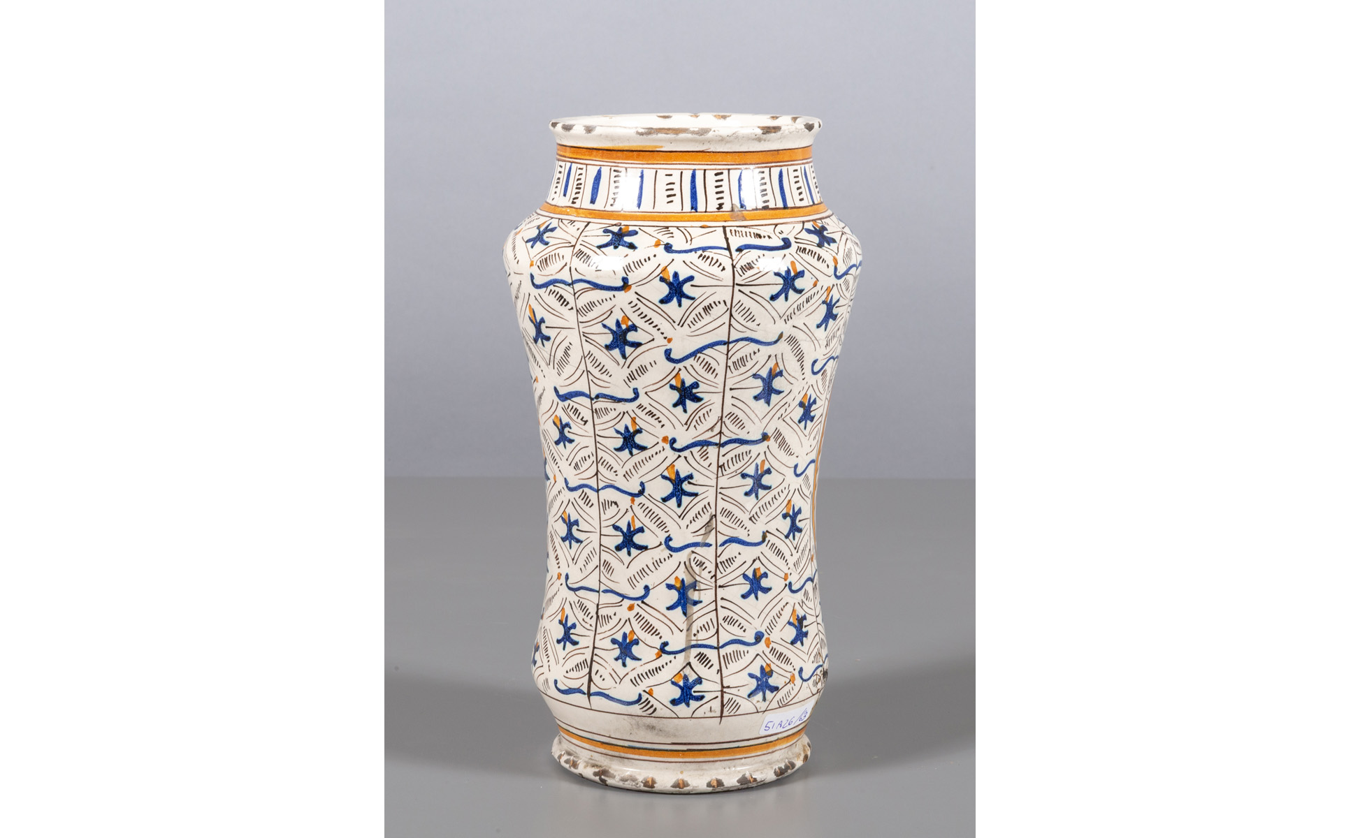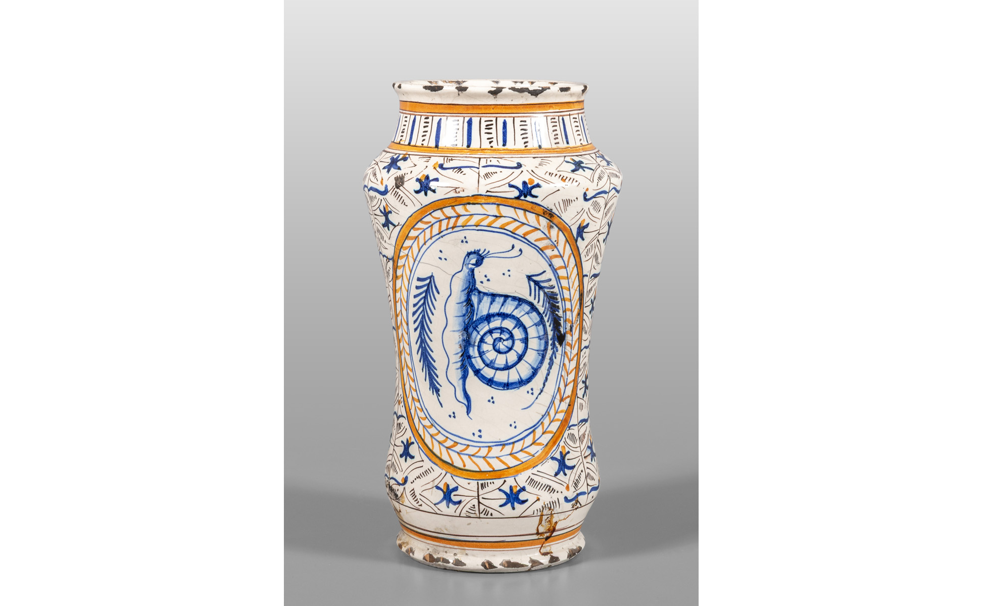 Albarello in maiolica policroma decorato con foglie e chiocciola centrale, Spagna sec.XVIII