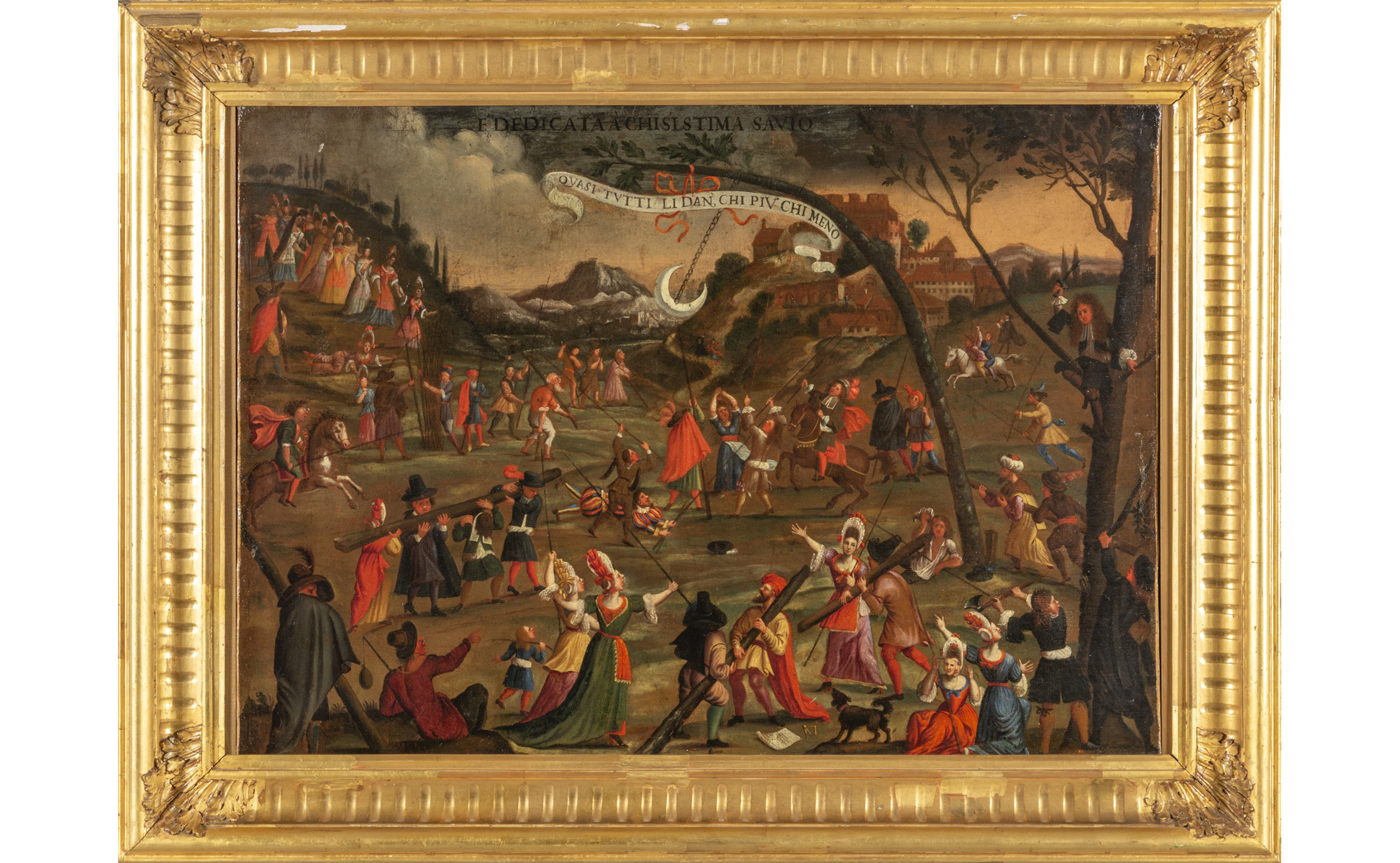 Scuola veneta sec.XVIII "Quasi tutti li dan, chi più e chi meno" olio, cornice in legno intagliato e dorato