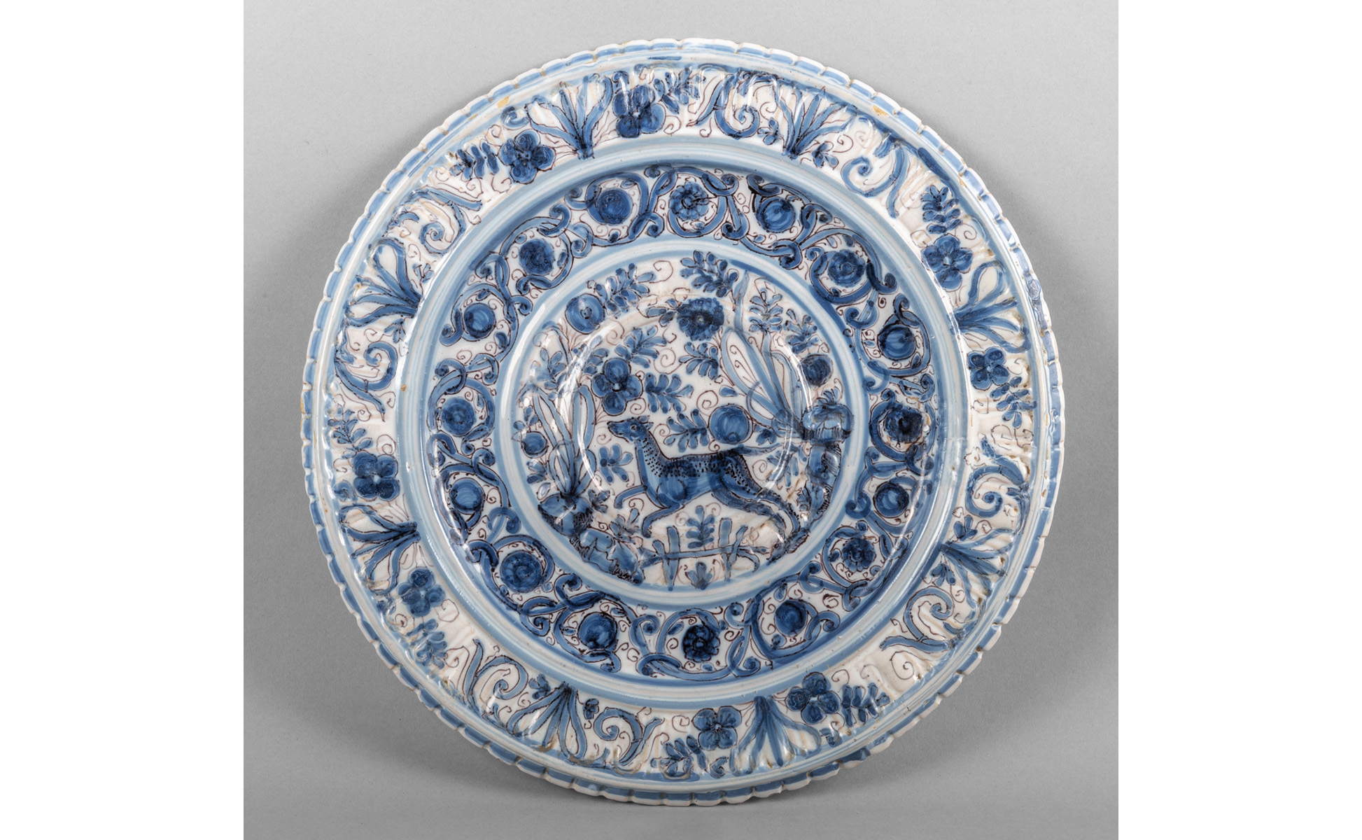 Piatto in maiolica a decoro calligrafico bianco e blu, Savona sec.XVII