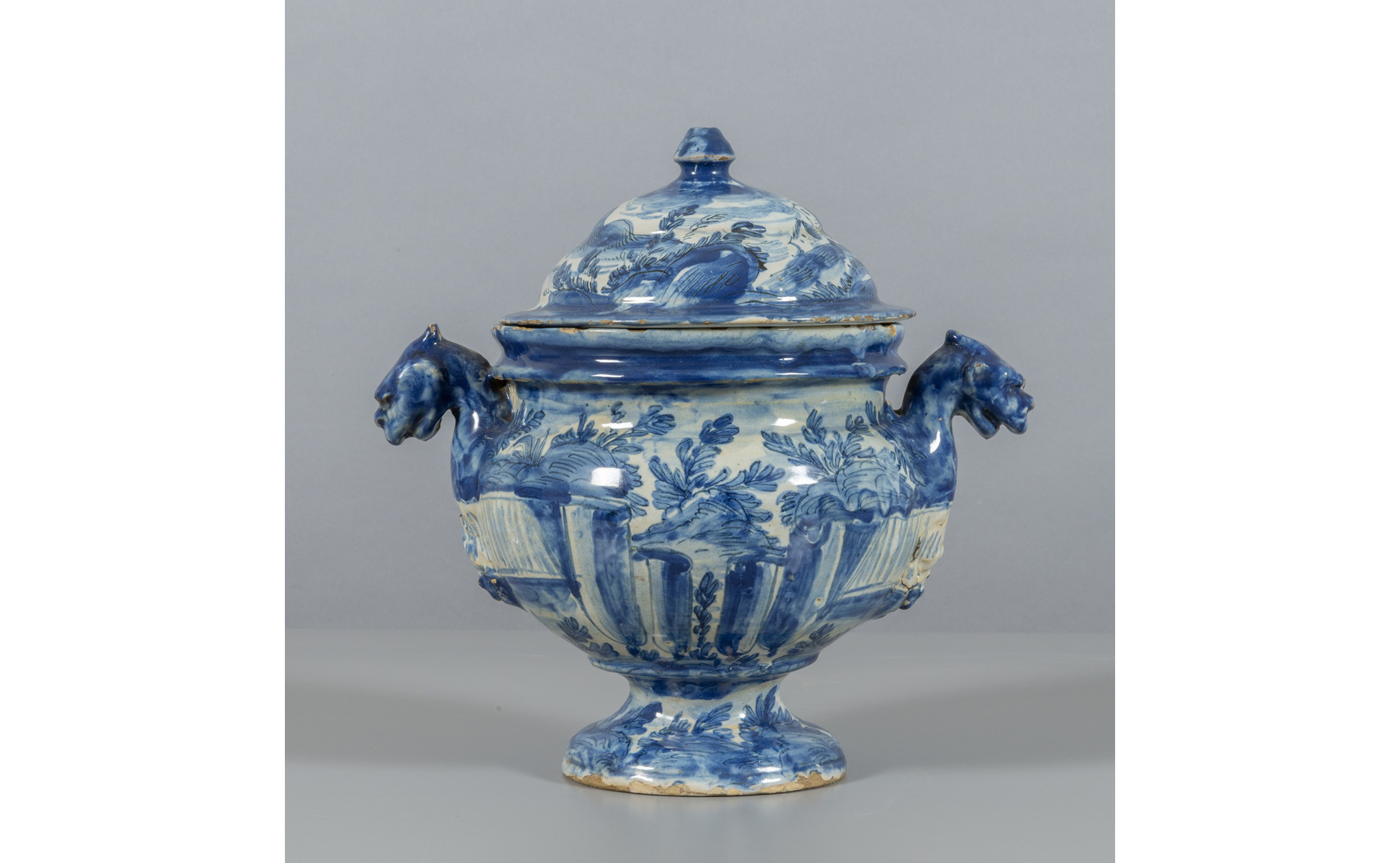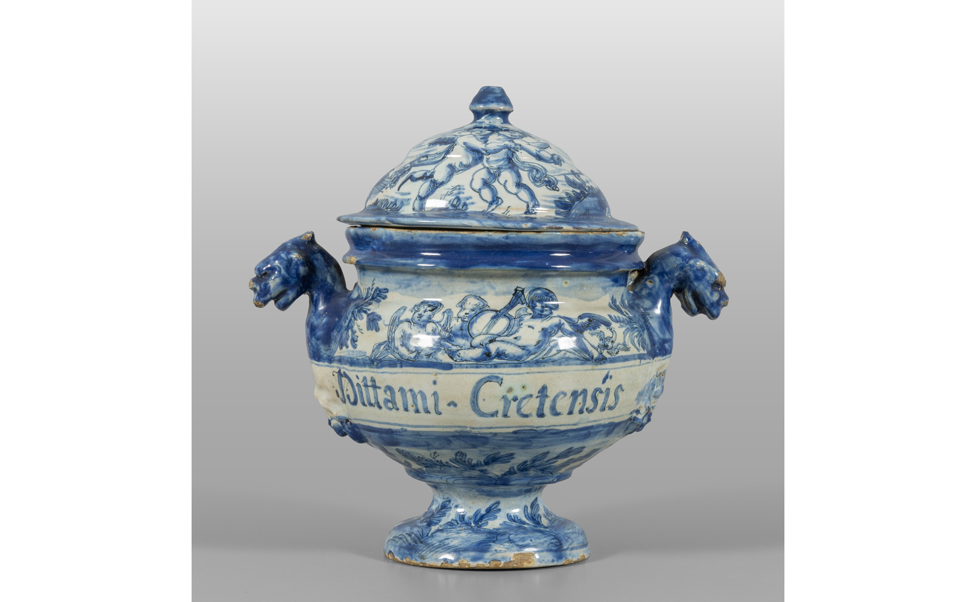 Unguentario in maiolica a decoro bianco e blu con putti e scritta medicinale "Dittami Cretensis", Savona sec.XVIII