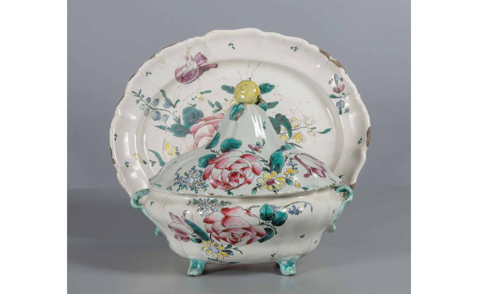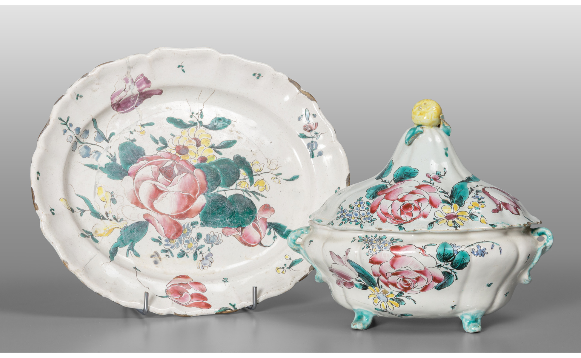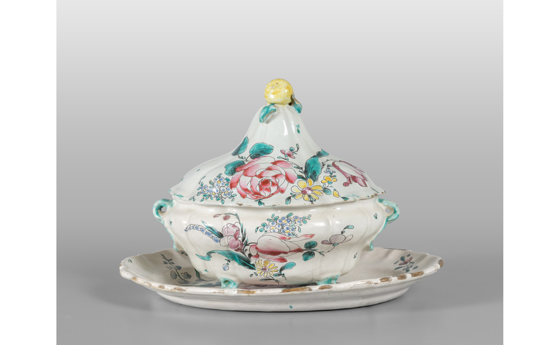 Zuppiera con piatto in maiolica policroma decorata alla rosa con mazzetti di fiori e foglioline sparse, piatto f.to Jacques Boselly, Savona sec.XVIII