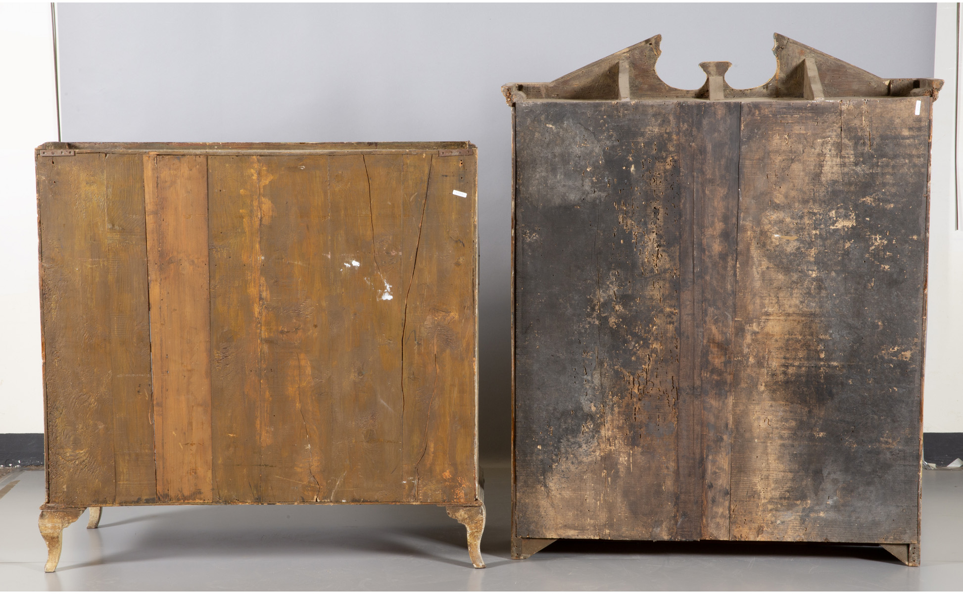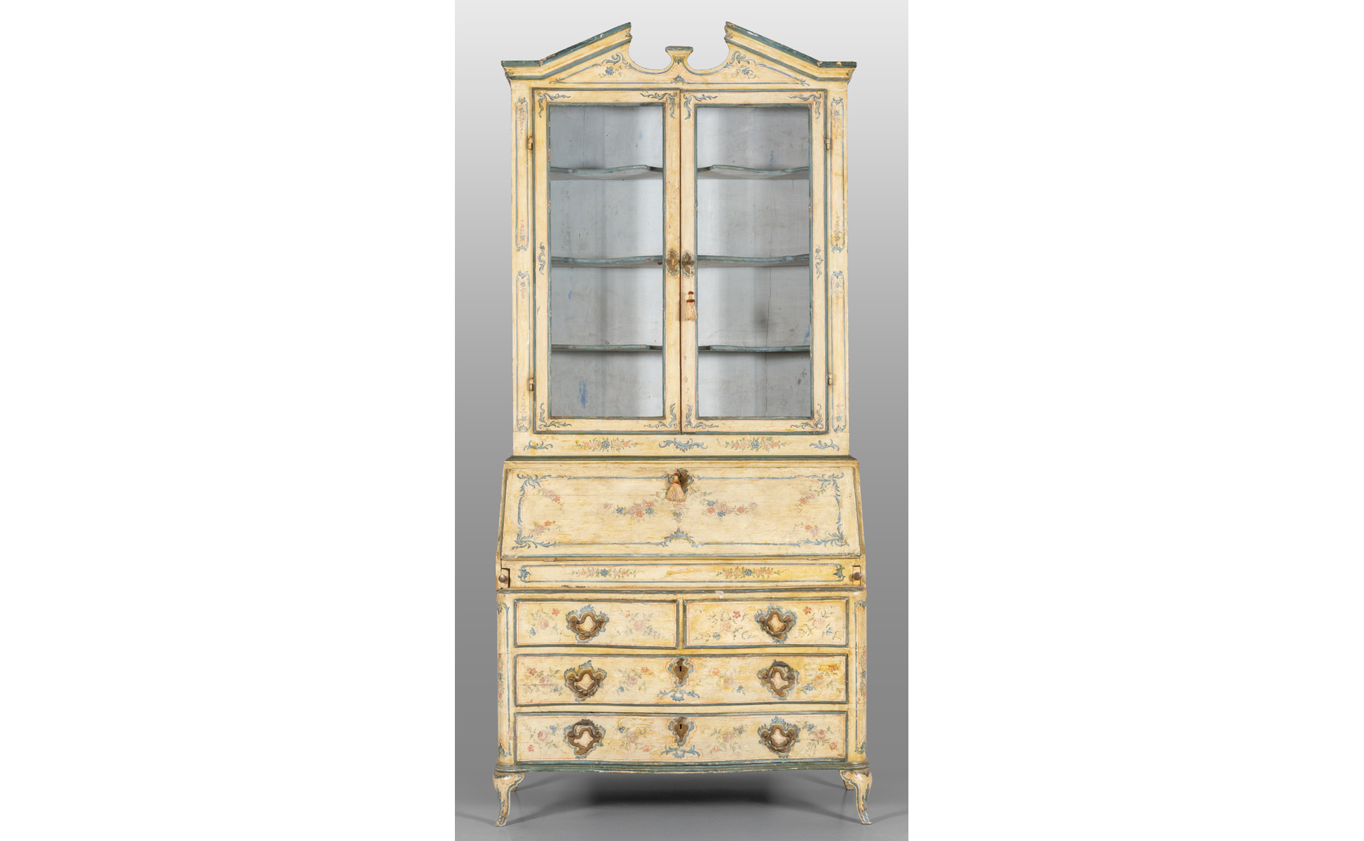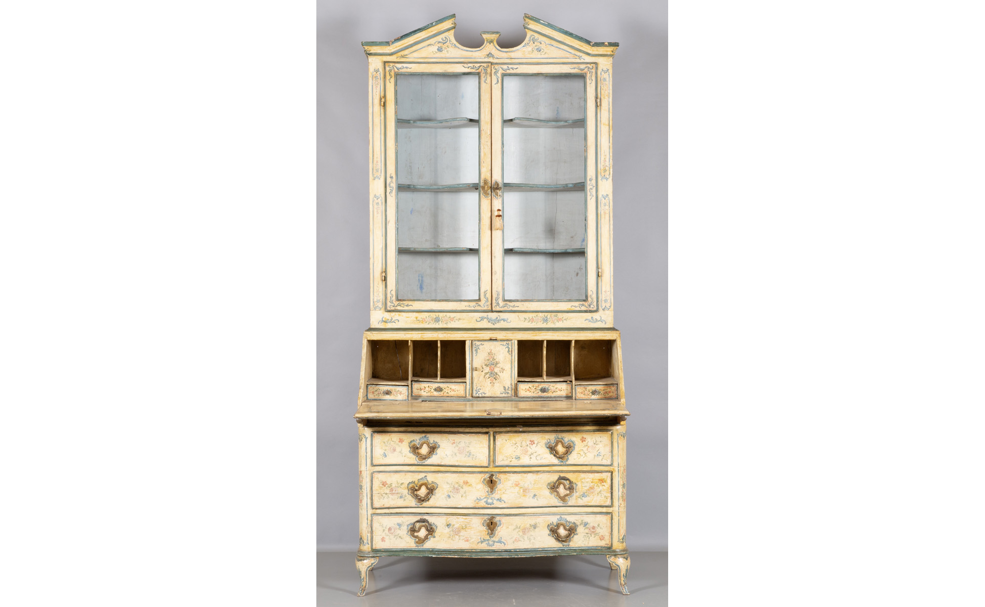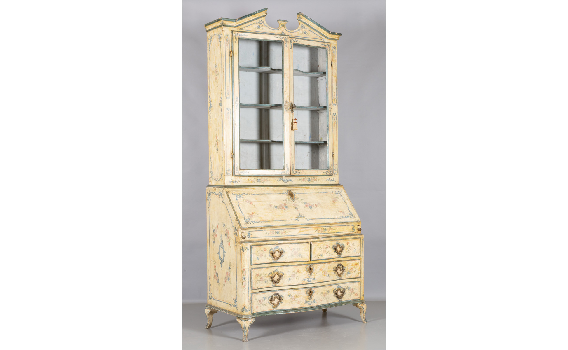 Mobile a doppio corpo in legno laccato in policromia a fiori, parte inferiore a cassetti con calatoia, parte superiore a due sportelli a giorno, Genova sec.XVIII