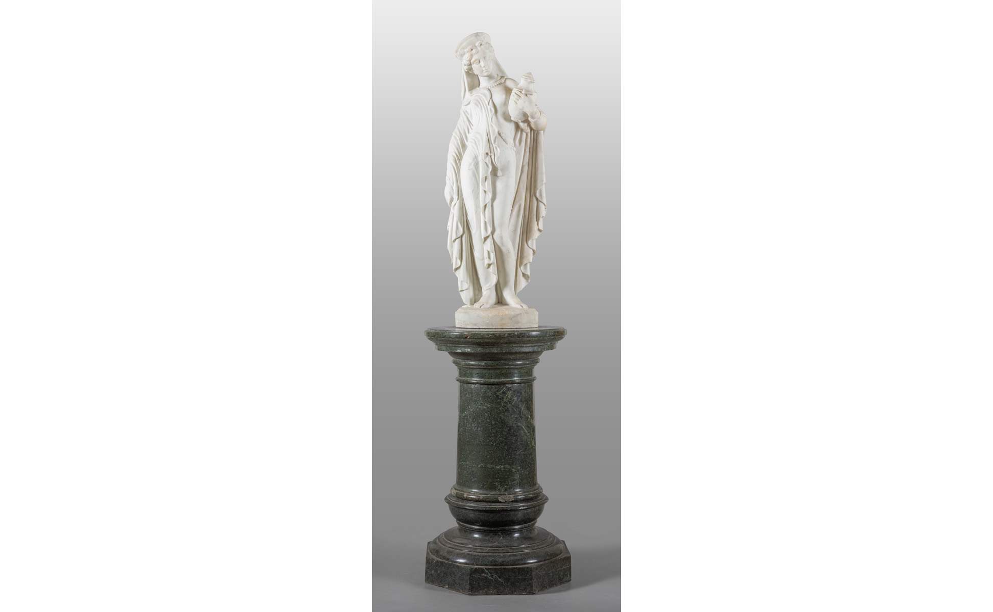 Vestale con vaso, scultura in marmo bianco, metà sec.XIX (h.cm.97), poggiante su base in marmo verde girevole (h.cm.90)