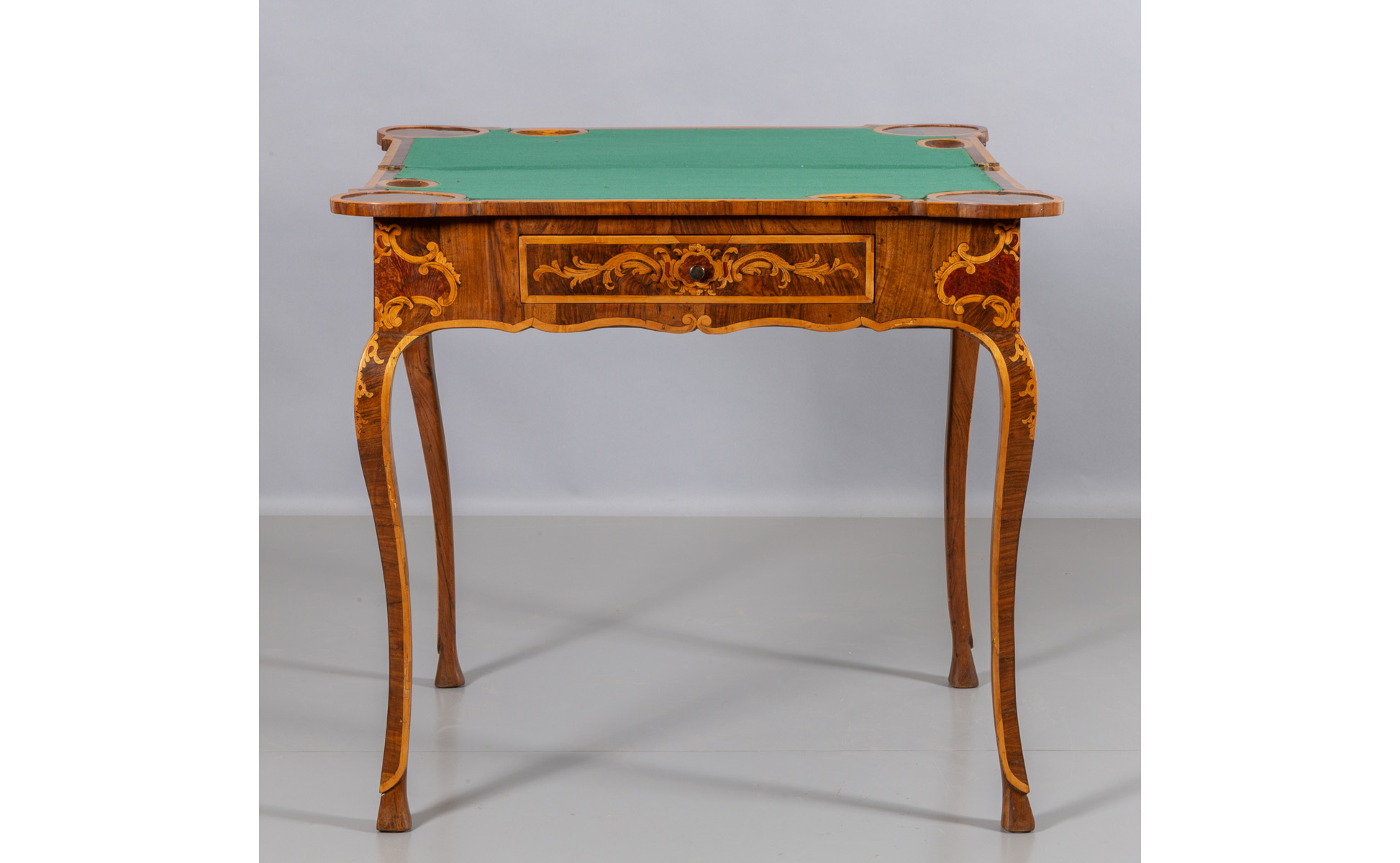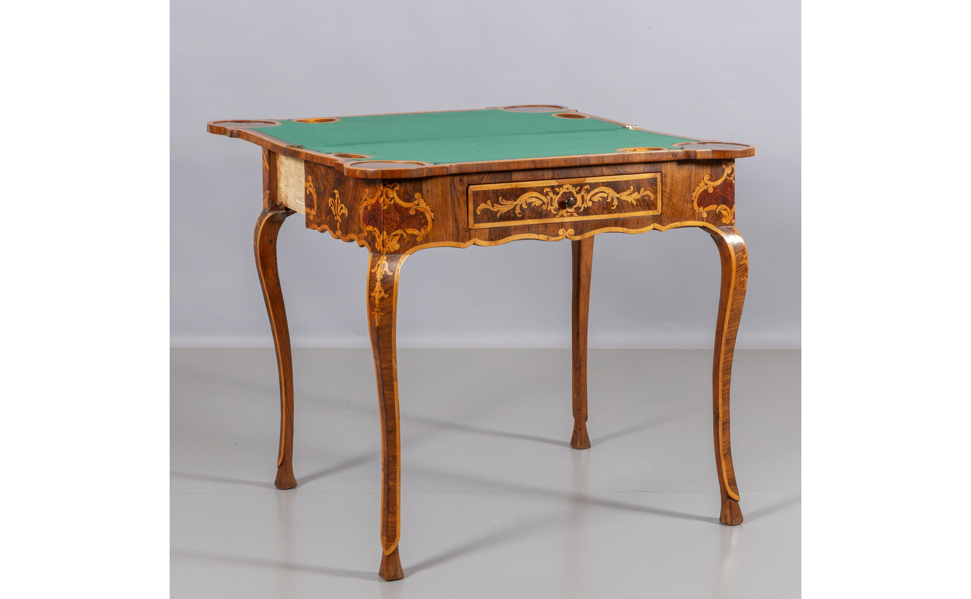 Tavolo da gioco Luigi XV in legno, ricca decorazione in acero e avorio, un cassetto nella fascia, Piemonte sec.XVIII