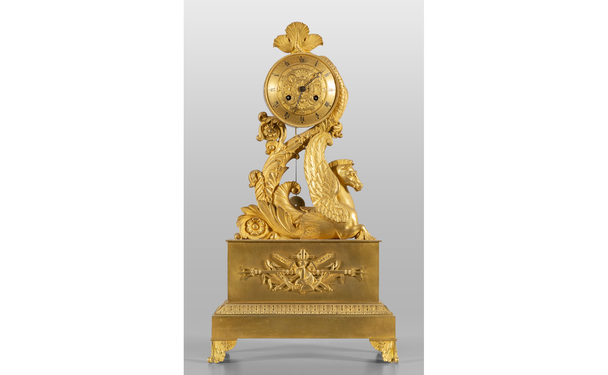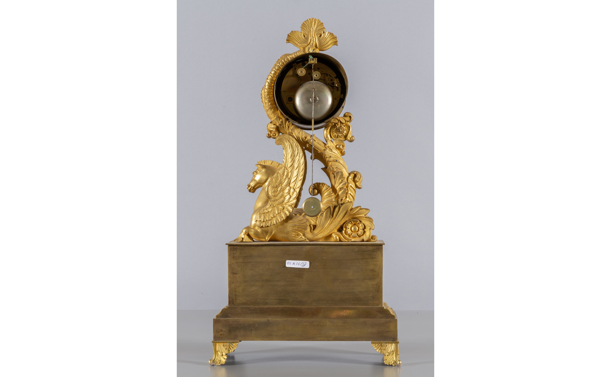 Pendola Restaurazione in bronzo dorato decorata con cavallo marino, sec.XIX