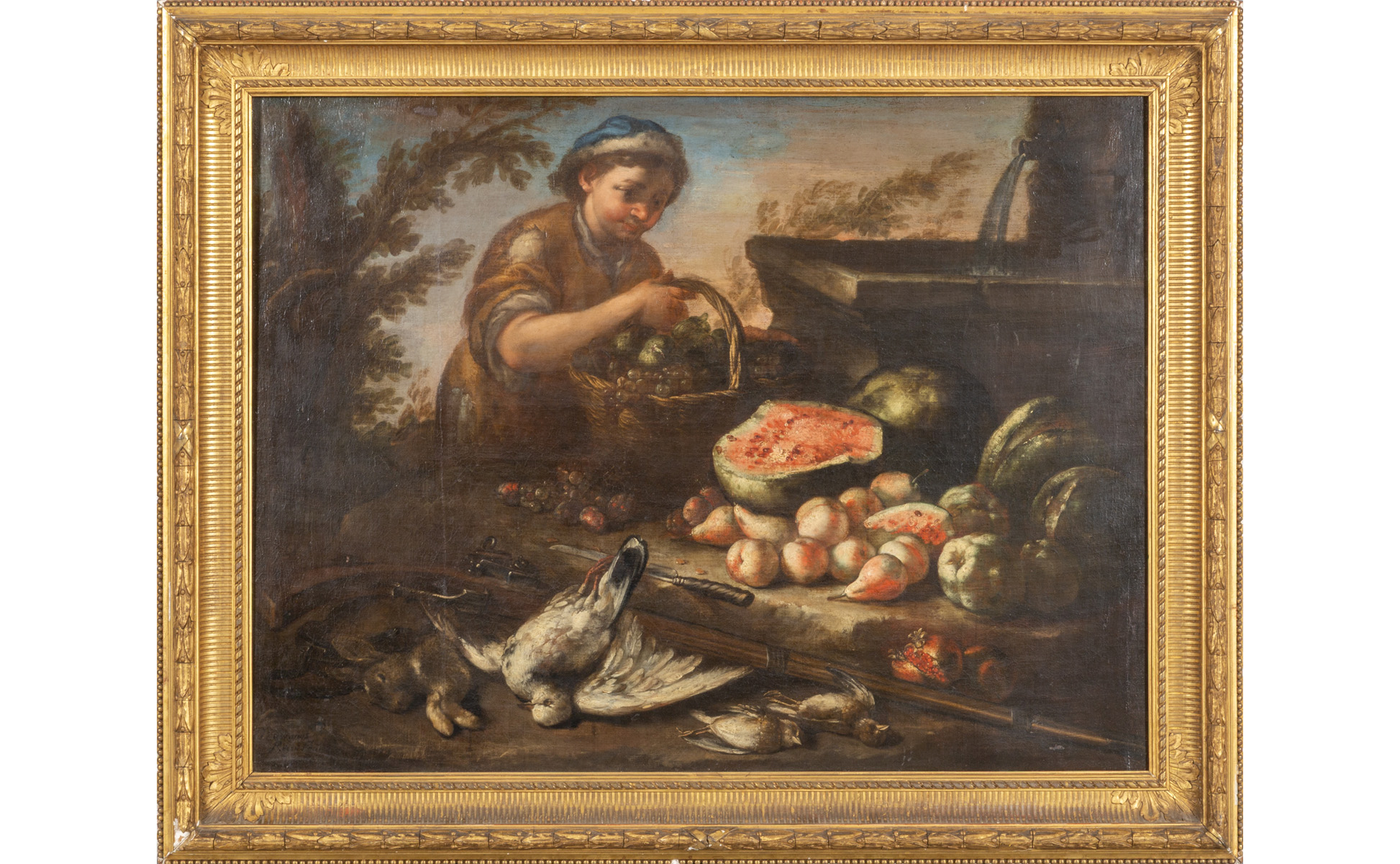 "Il venditore di frutta e selvaggina" olio, f.to in b. a s.