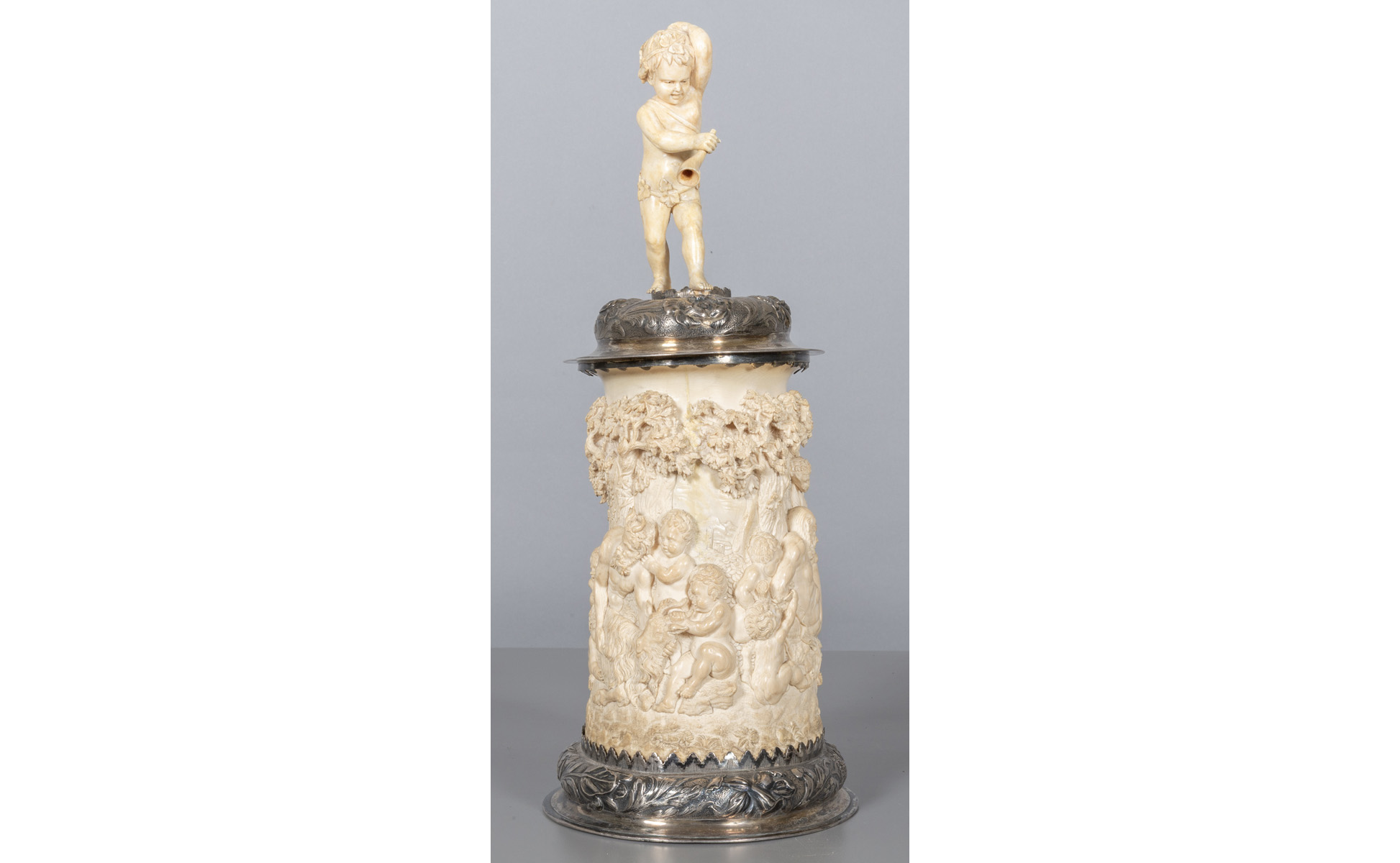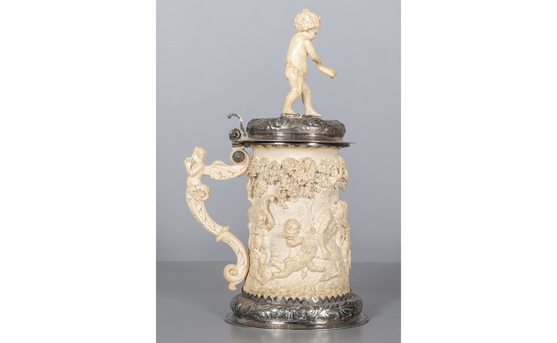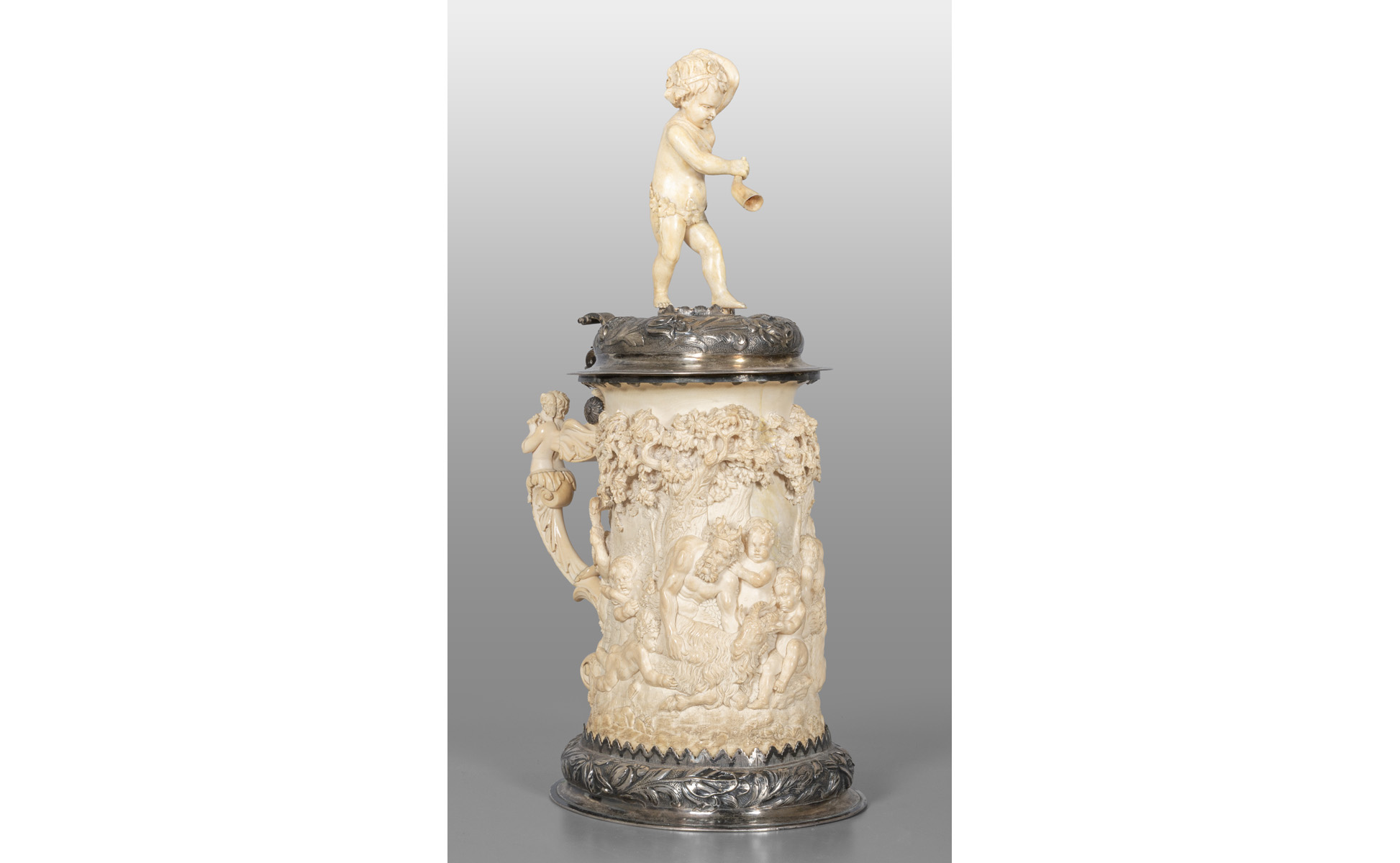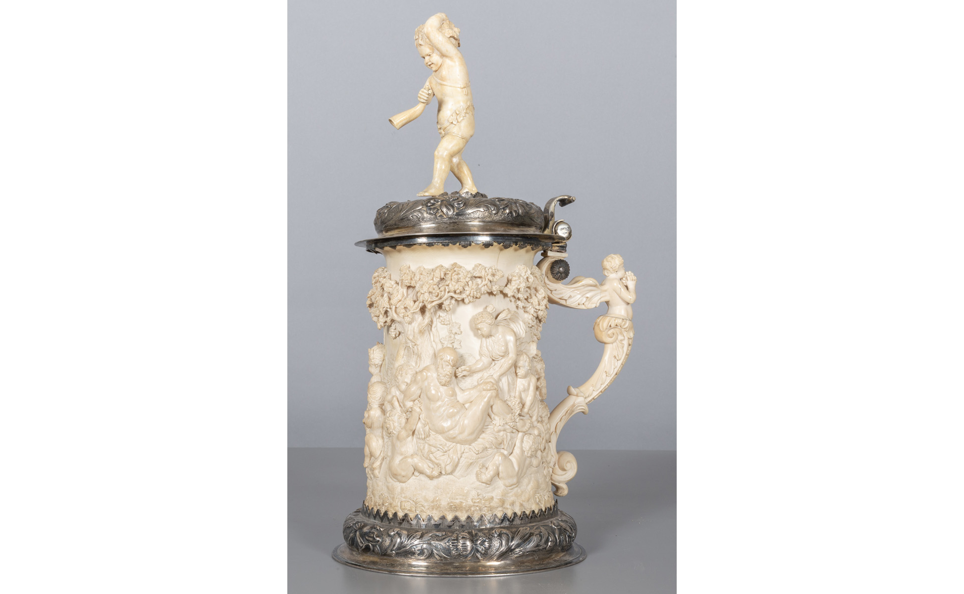 Importante tankard in avorio scolpito con ricca applicazione in argento, raffigurante Bacco ebbro contornato da putti, Germania sec.XIX