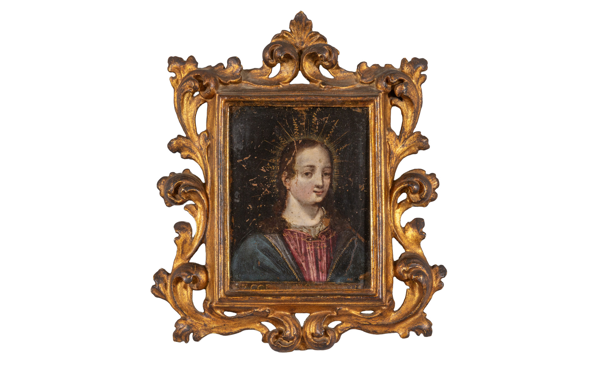 Scuola fiamminga inizi sec.XVII 'Bambin Gesù' olio su rame cornice in legno intagliato e dorato