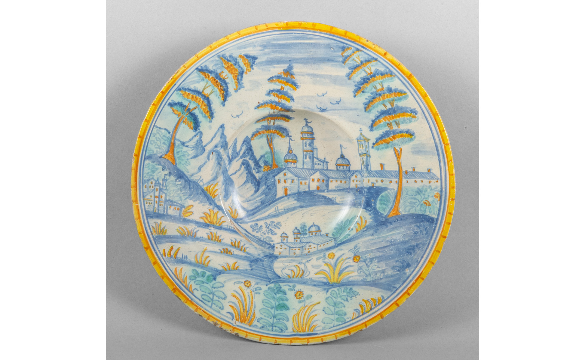 Piatto in maiolica decorato in policromia a paesaggio Deruta sec.XVIII