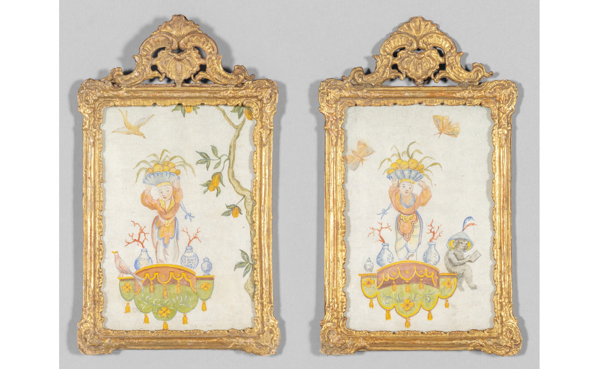 Scuola piemontese sec.XVIII 'Cineserie' coppia di acquarelli in belle cornici in papier machè