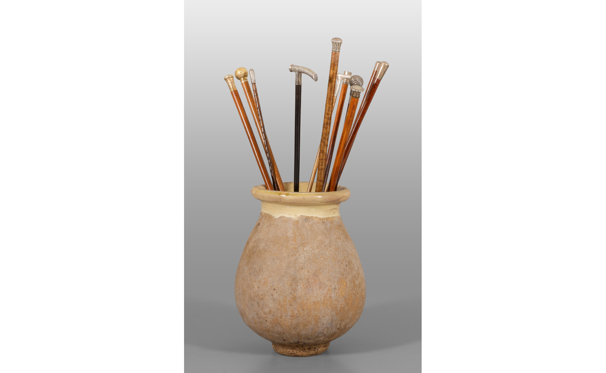 Orcio in terracotta contenente undici bastoni con pomoli in argento e metallo