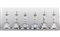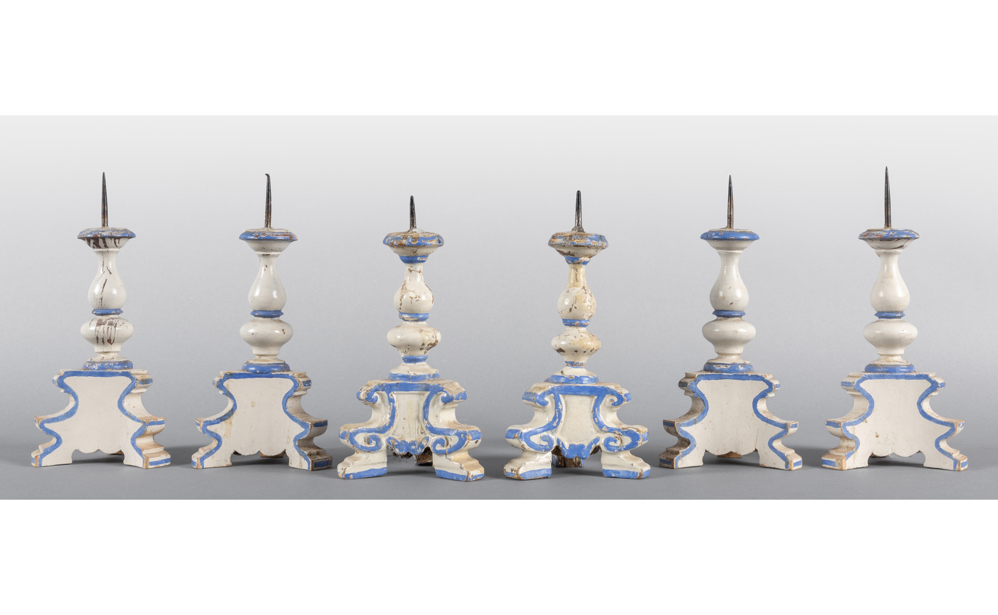 Sei piccoli candelieri in legno laccato bianco con profili in azzurro sec.XIX