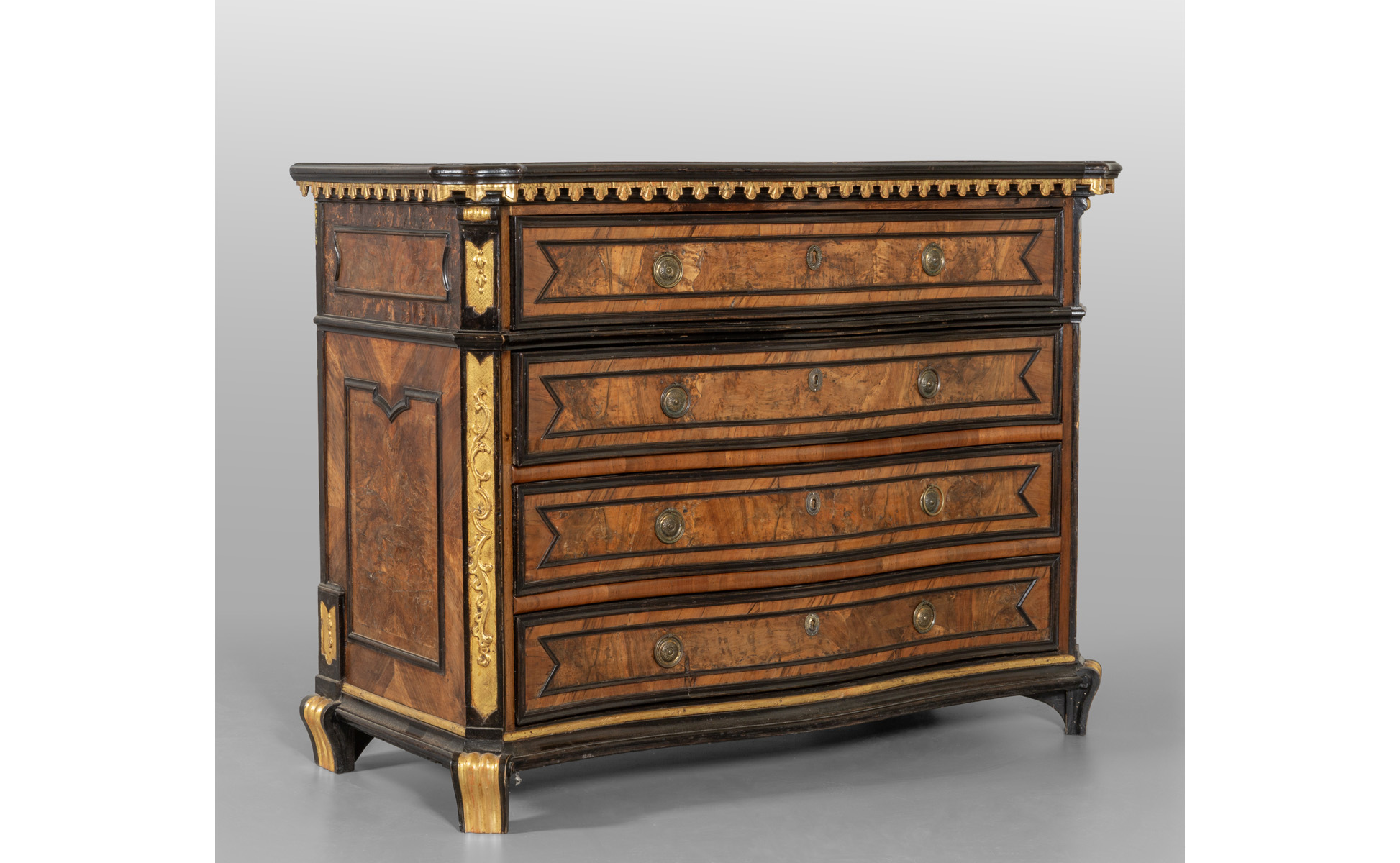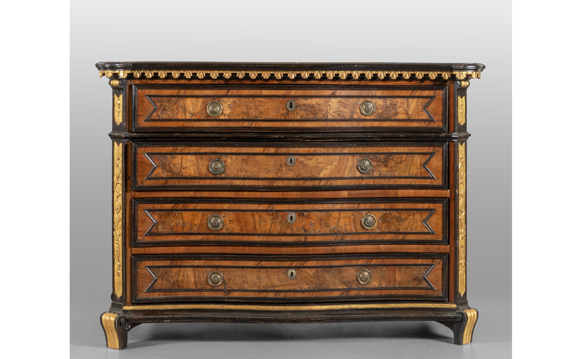 Canterano Luigi XIV lastronato in noce e radica di noce ricca decorazione di cornicette in legno ebanizzato fianchi scantonati intagliati e dorati piano in legno con sgocciolatoio intagliato e dorato Lombardia I metà sec.XVIII