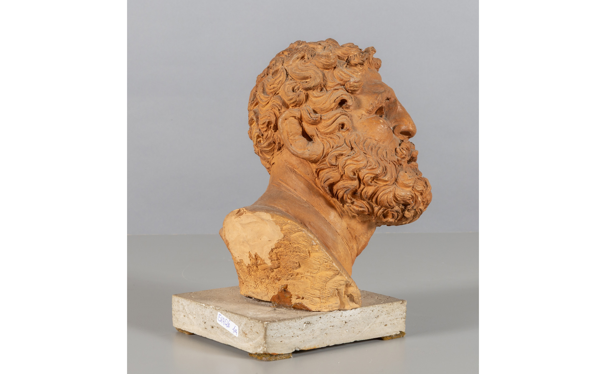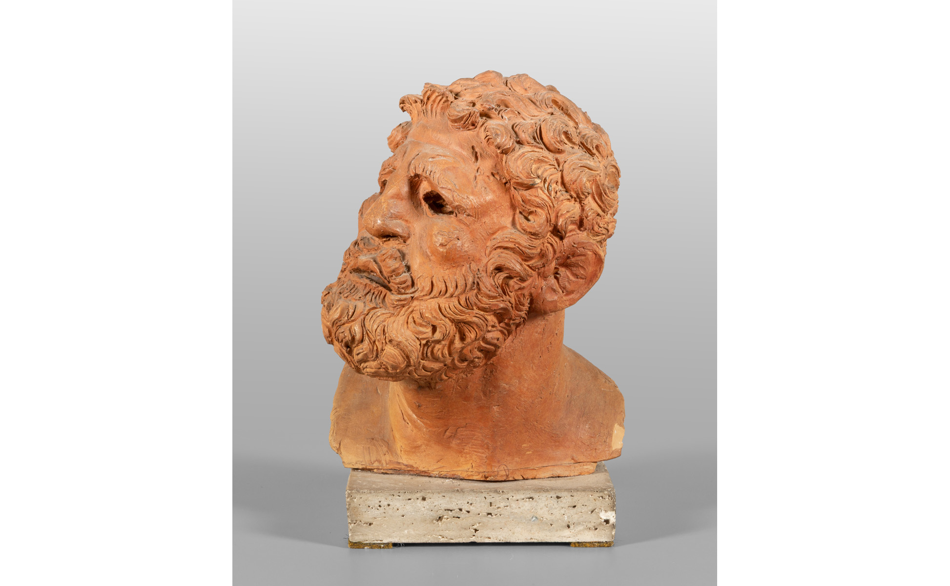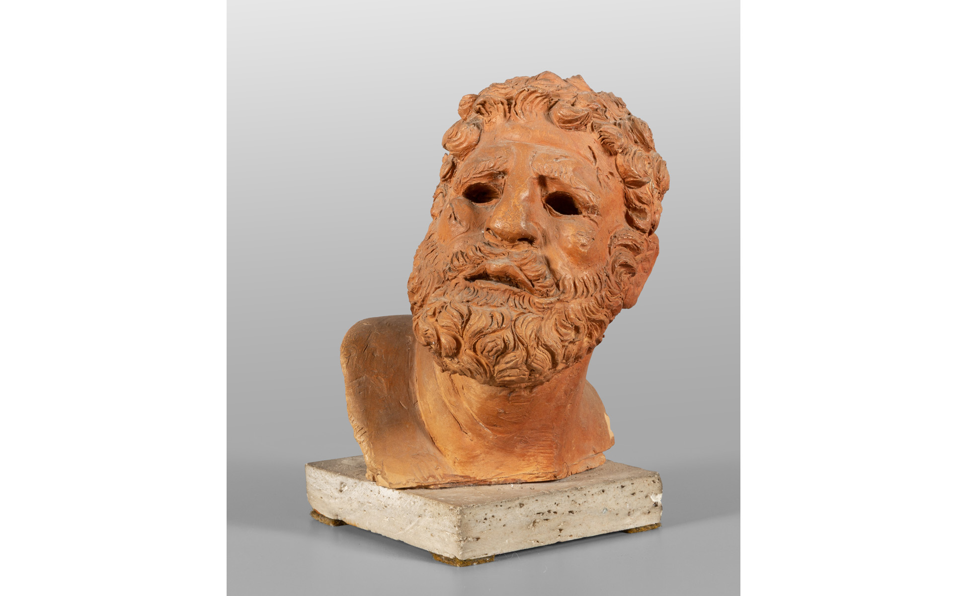 Volto di lottatore scultura in terracotta con base in travertino sec.XIX