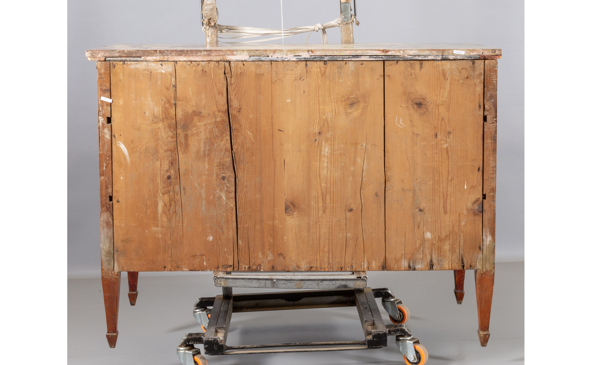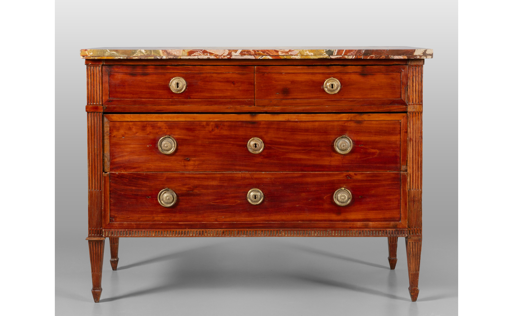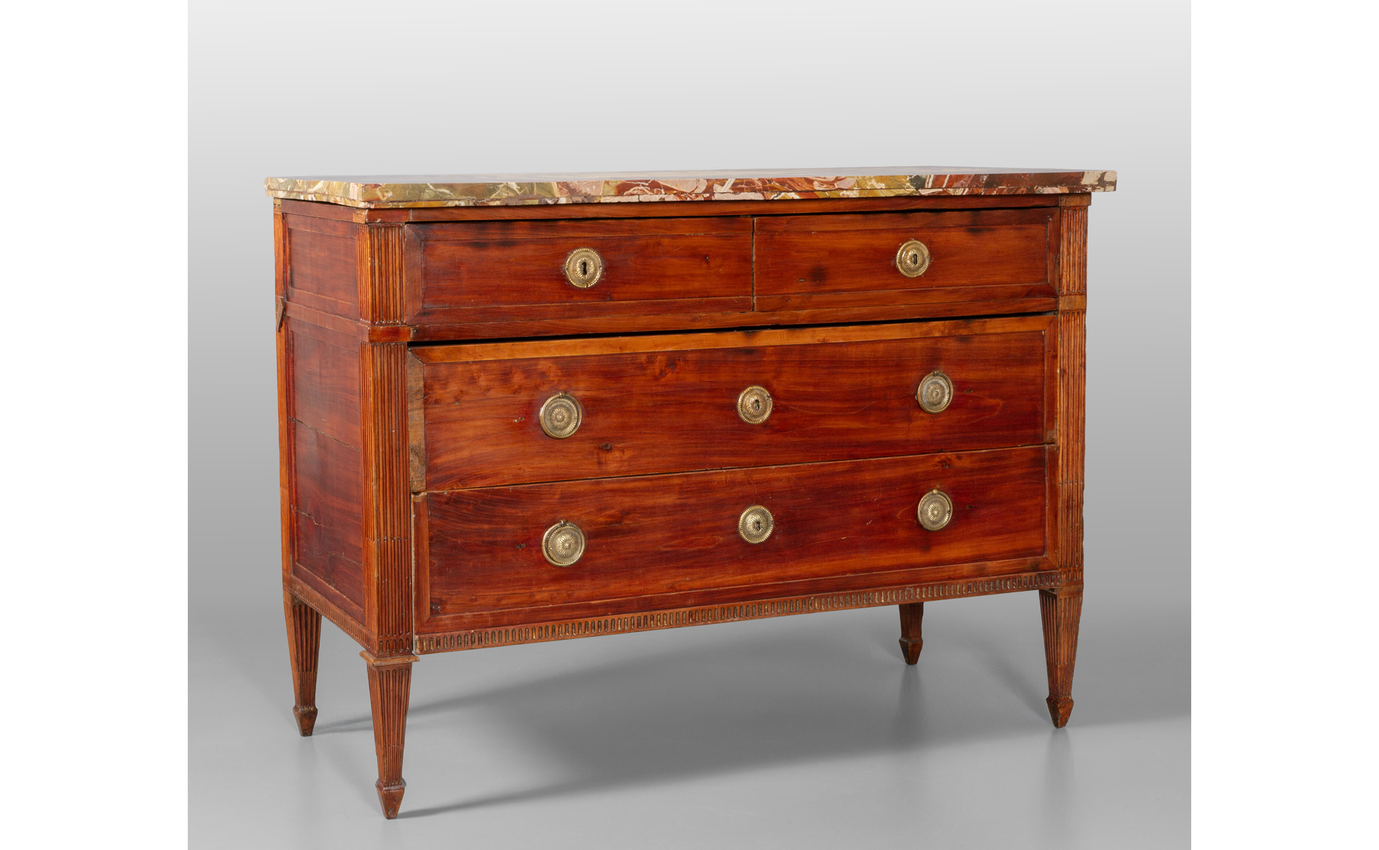 Comò Luigi XVI in ciliegio a due cassetti grandi più due piccoli montanti scanalati piano in breccia policroma Piemonte fine sec.XVIII