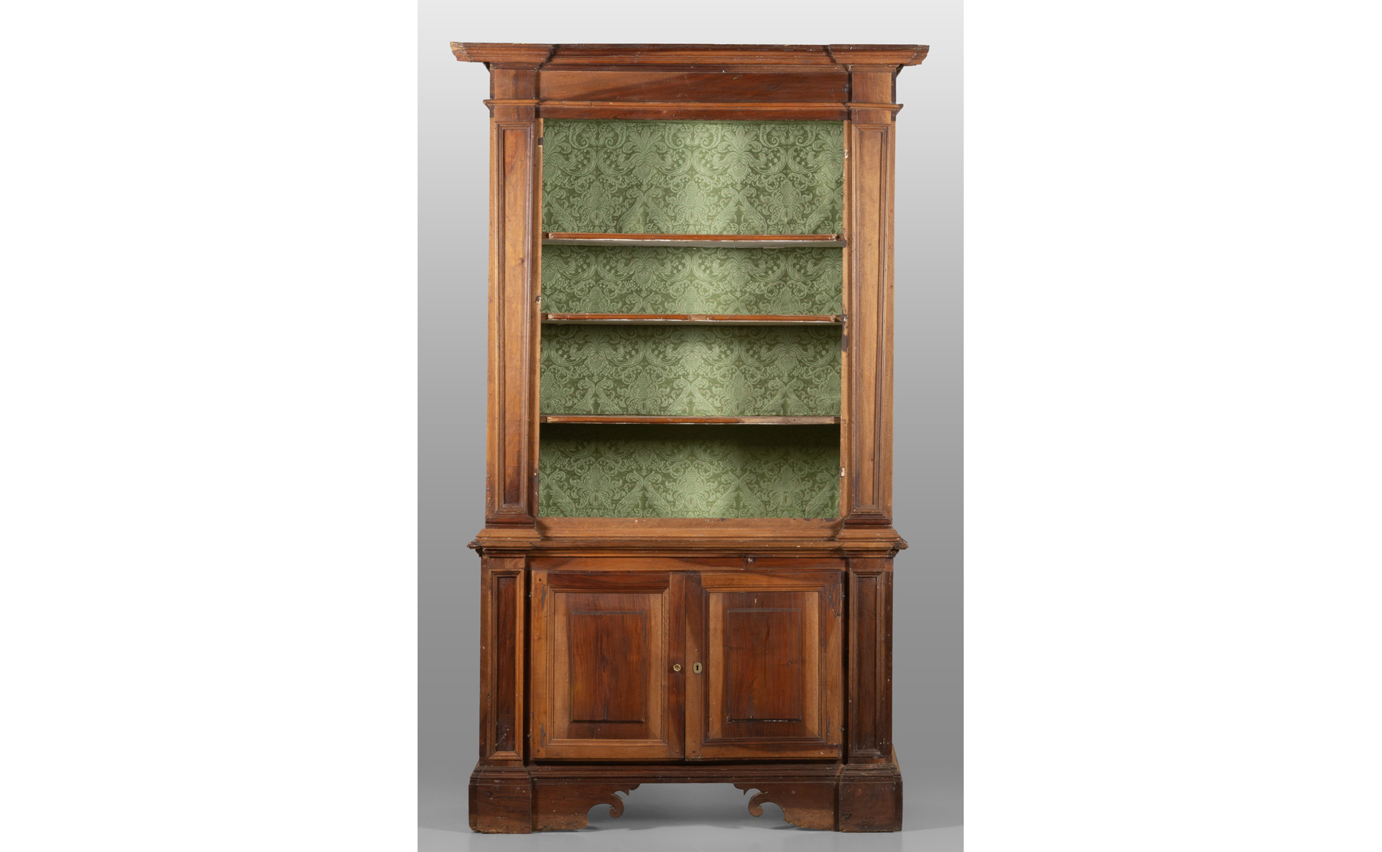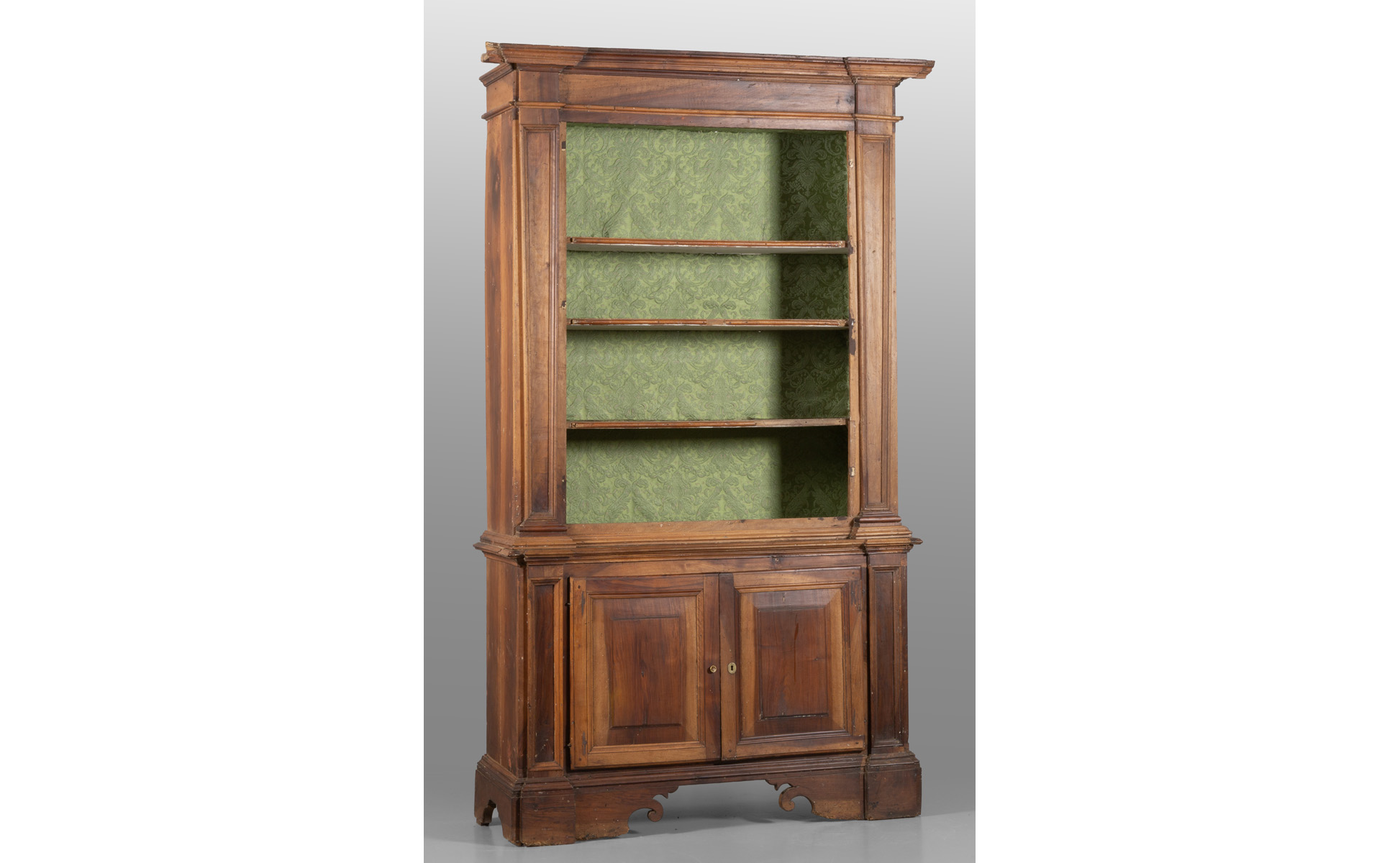 Libreria a due corpi in noce parte inferiore a due sportelli parte superiore a giorno sec.XVIII
