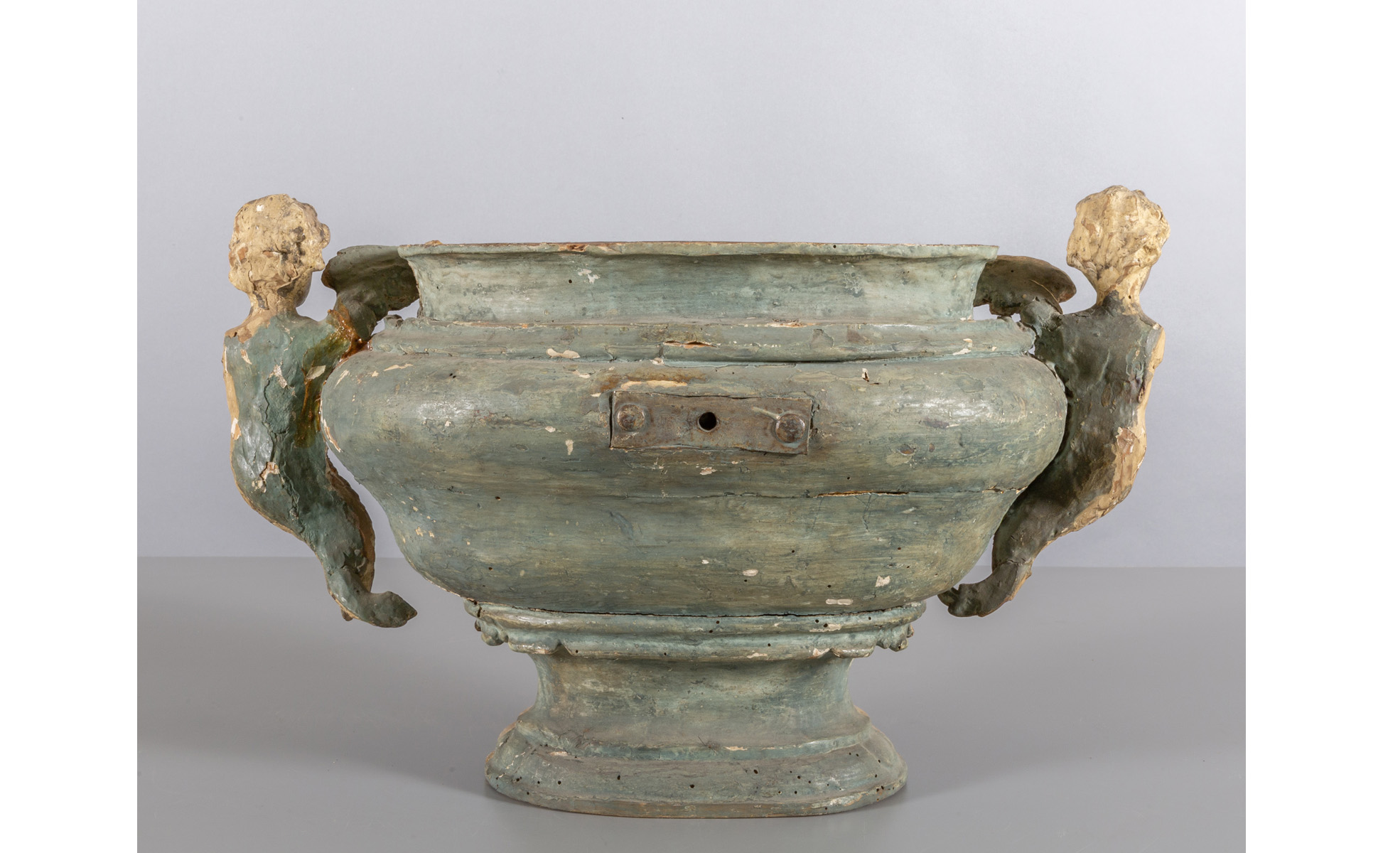 Vaso barocco in legno intagliato e dorato a mecca prese a forma di putti Italia Meridionale sec.XVIII