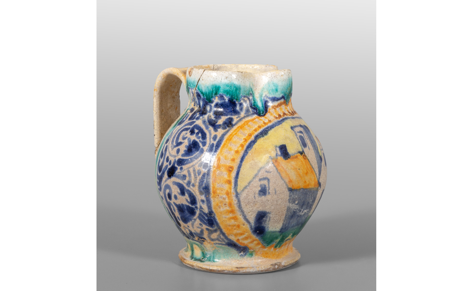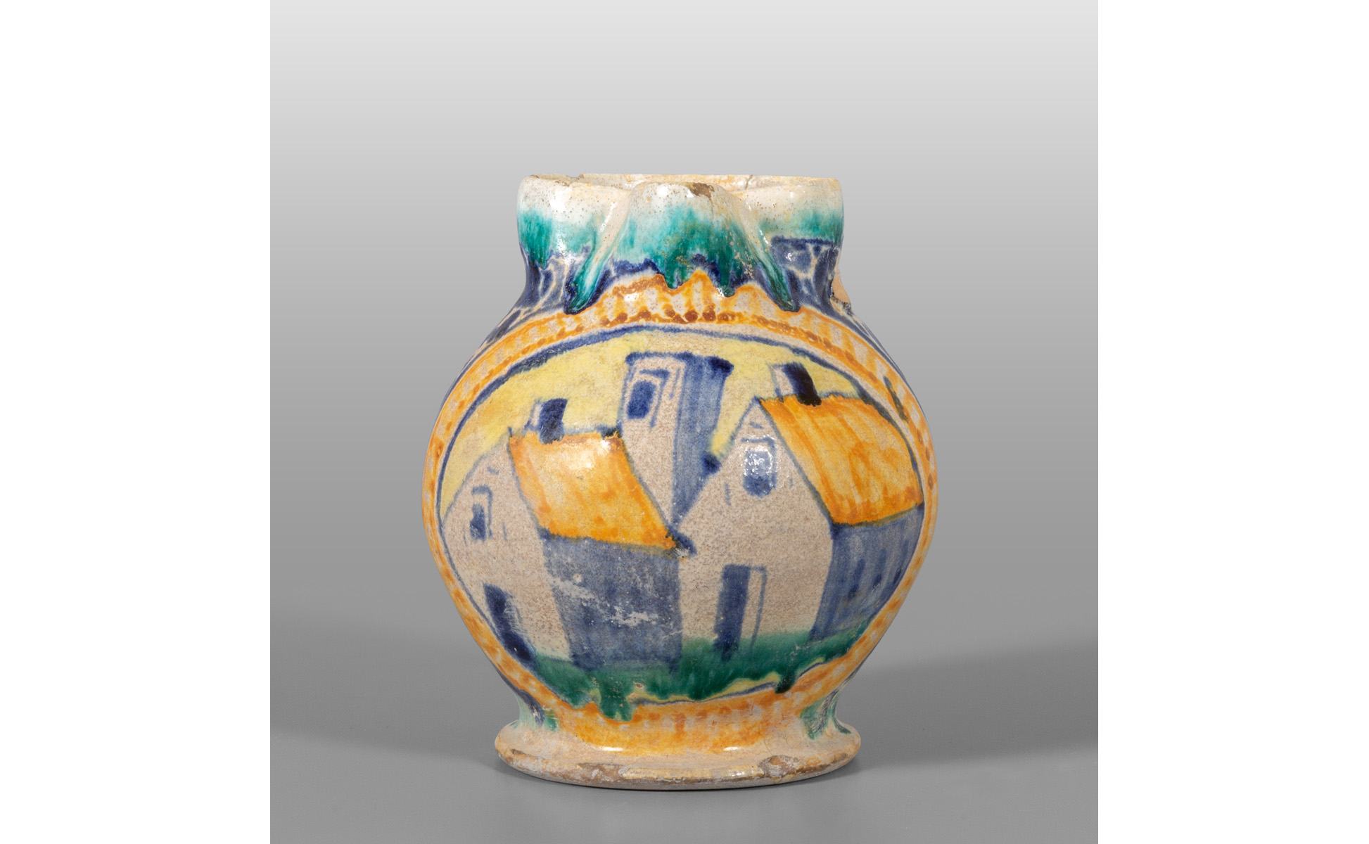 Brocchetta in maiolica policroma decorata con architettura Italia Centrale sec.XVIII