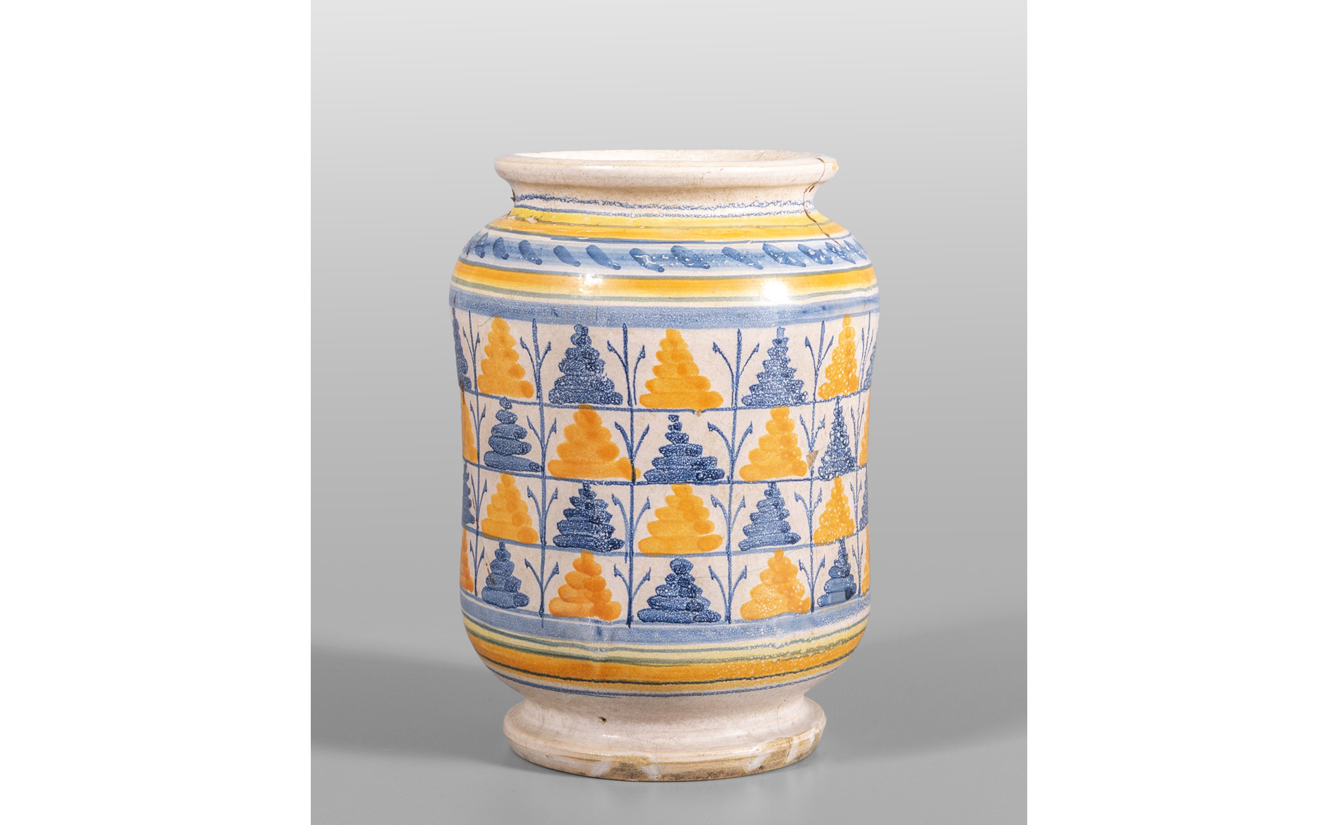 Albarello a rocchetto in maiolica policroma con decorazione a foglie blu e gialle Toscana sec.XIX