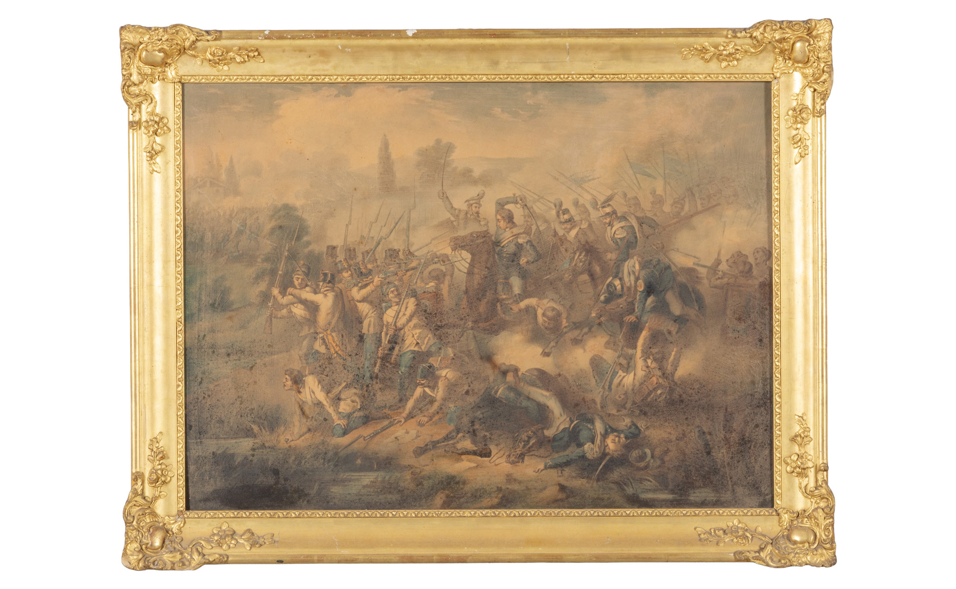 'Battaglia' stampa colorata cornice coeva in legno dorato sec.XIX