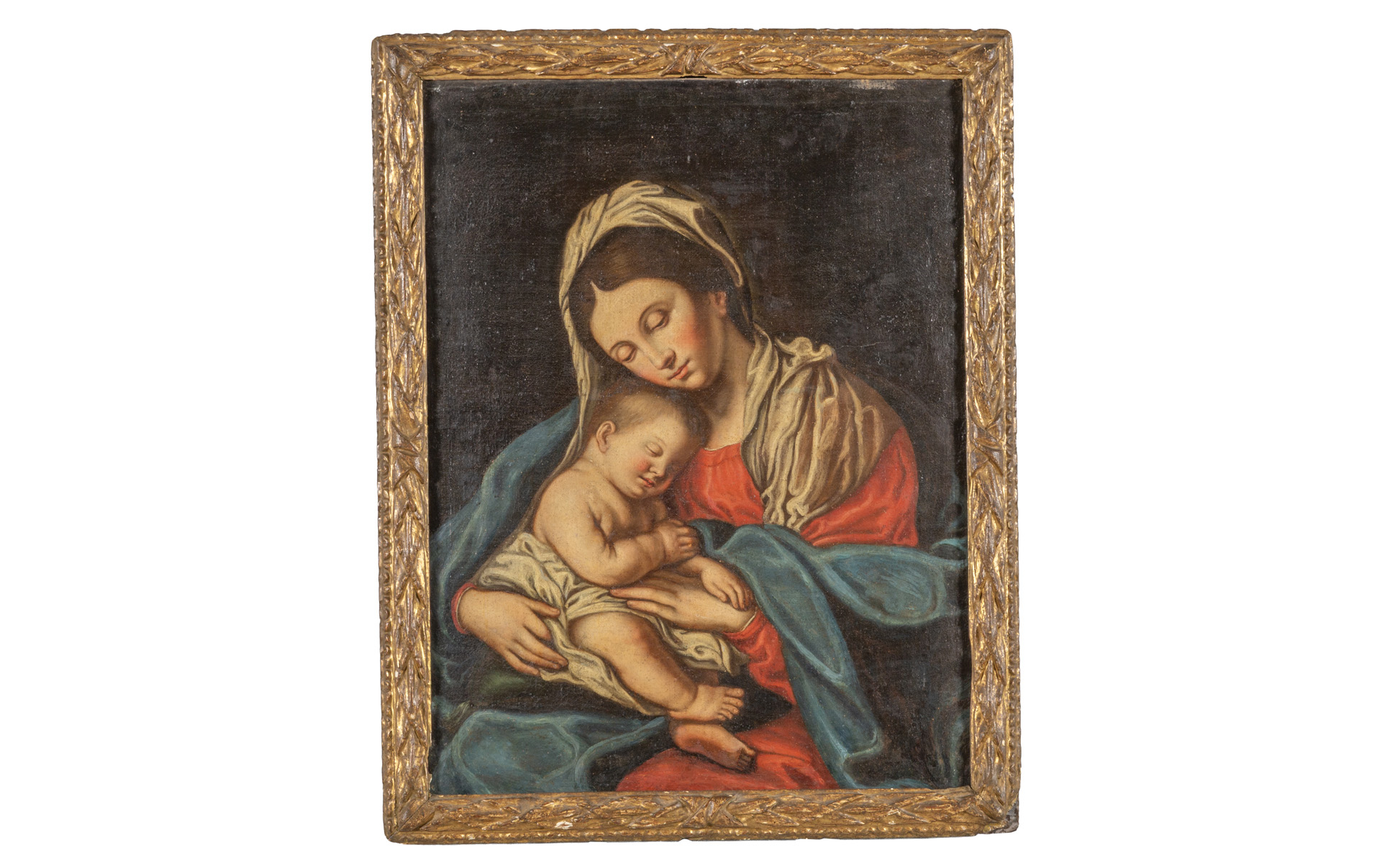 Scuola di G.B.Salvi detto il Sassoferrato (inizi sec.XVIII) 'Madonna con Bambino' olio cornice antica in legno intagliato e dorato