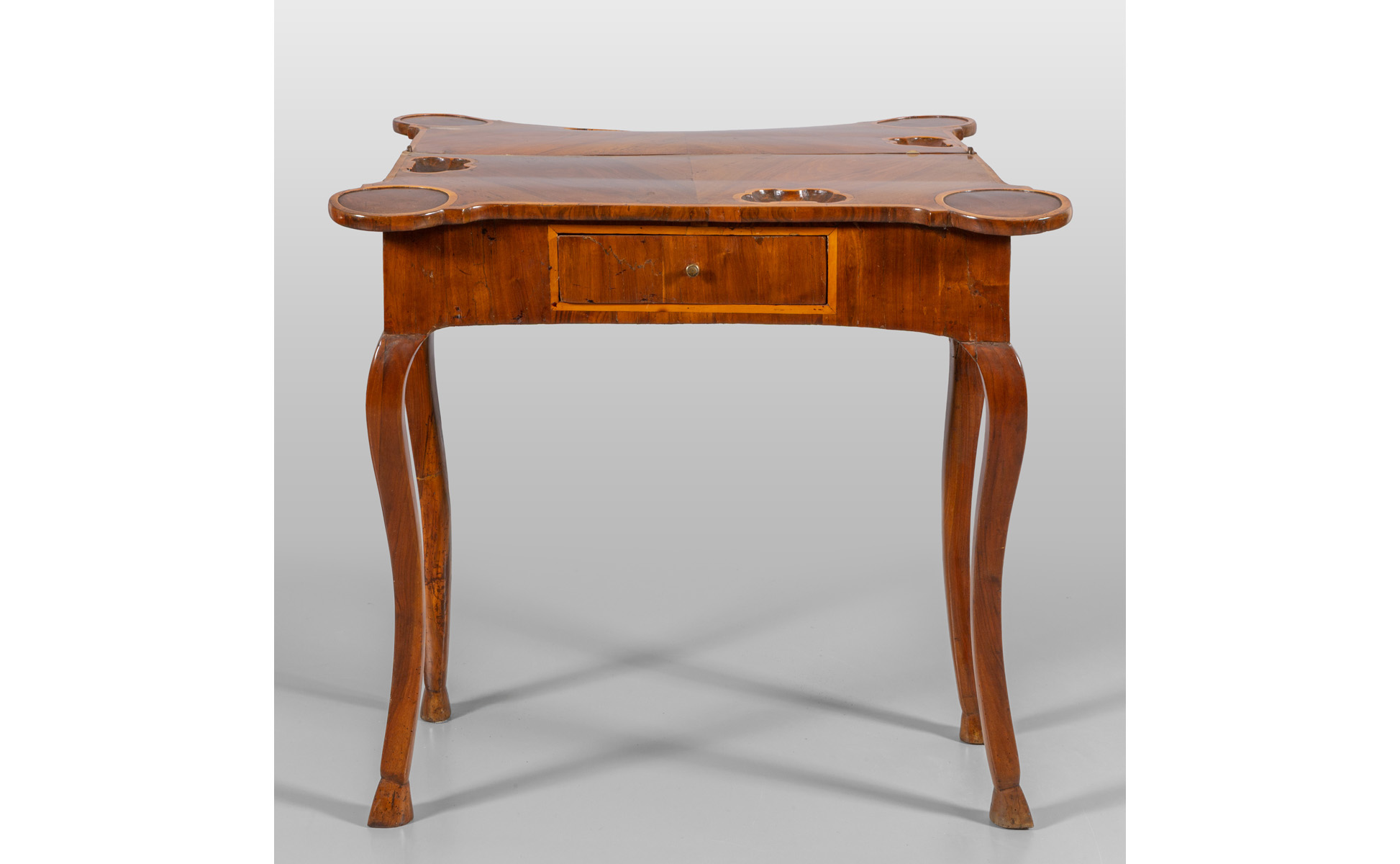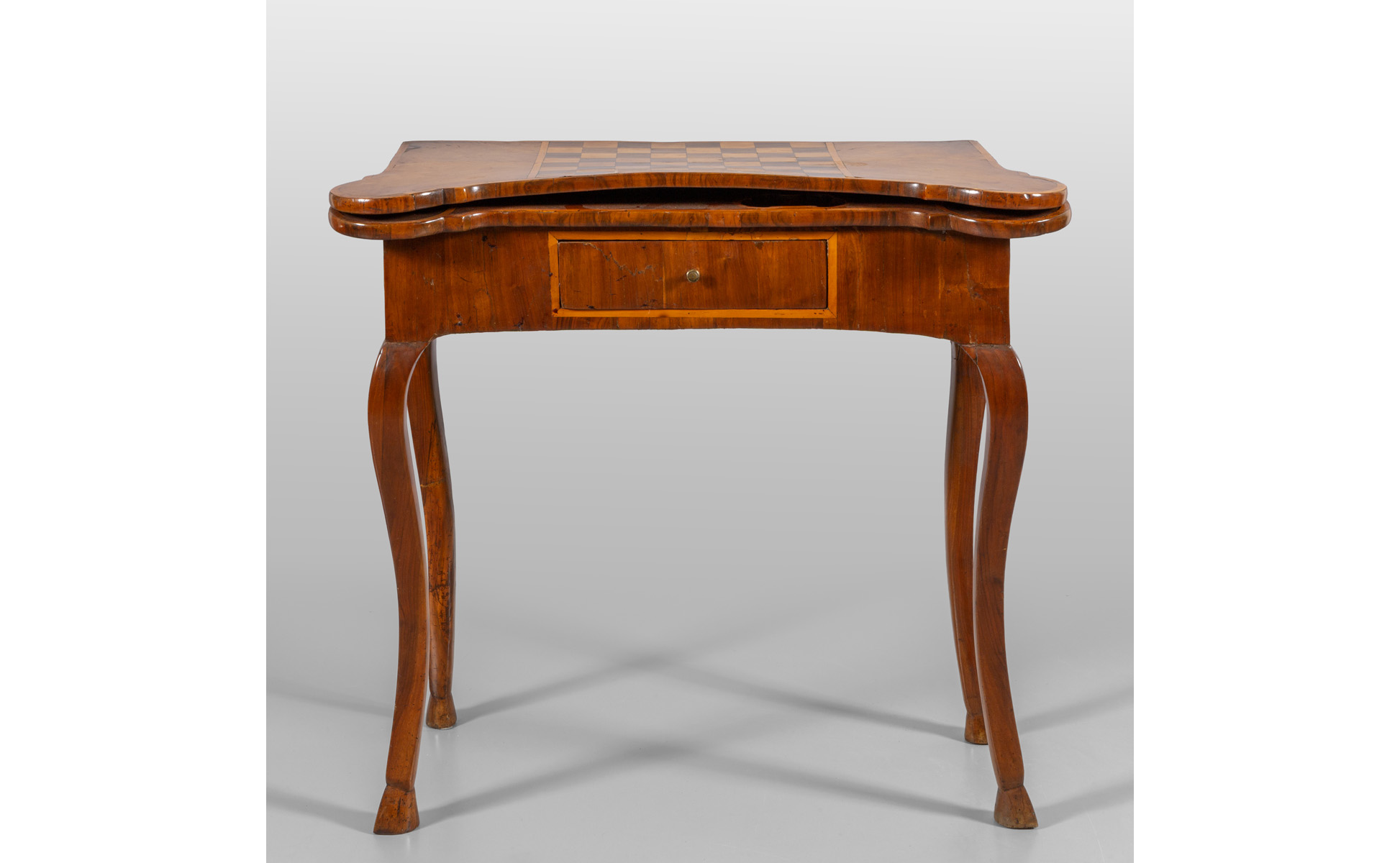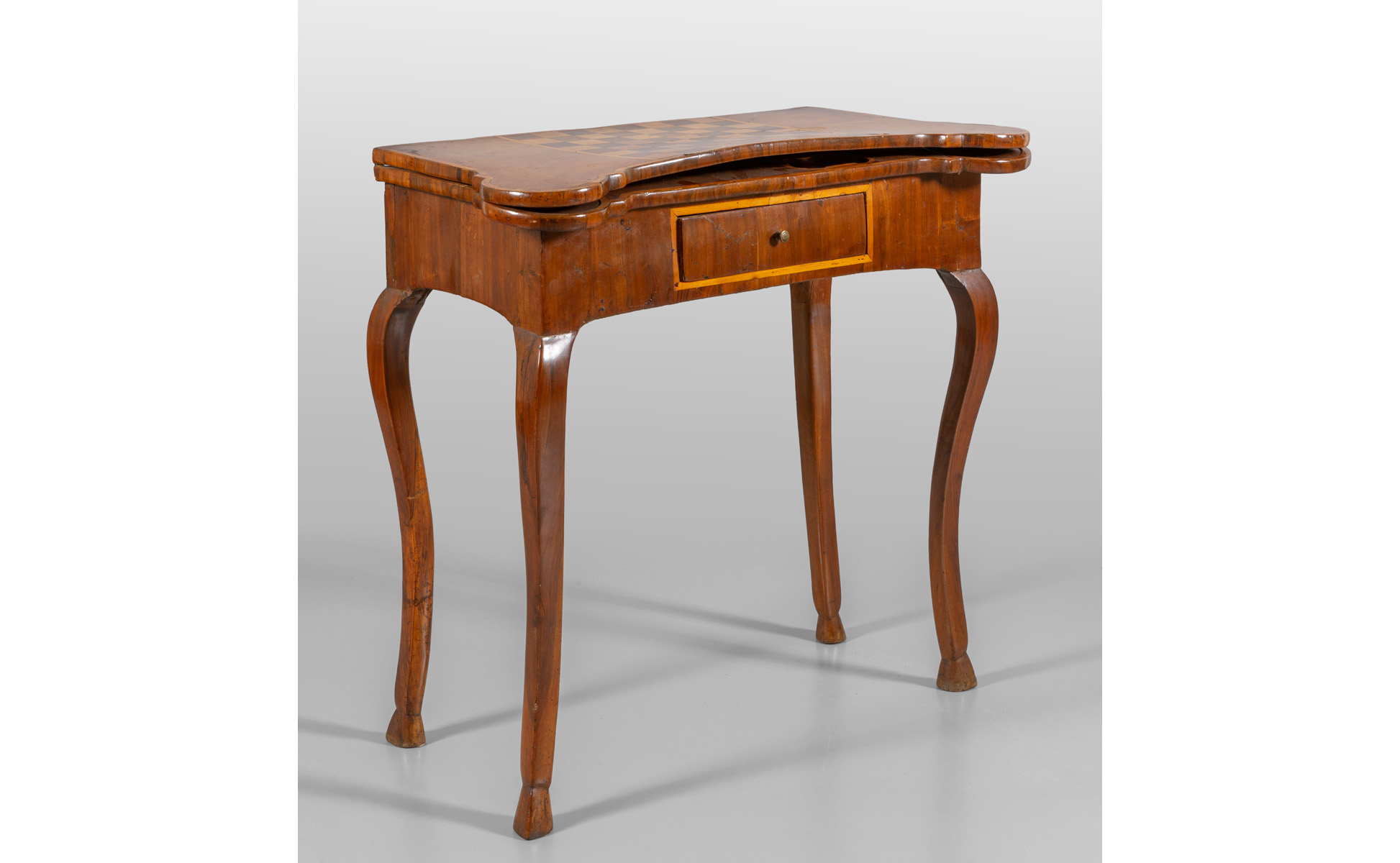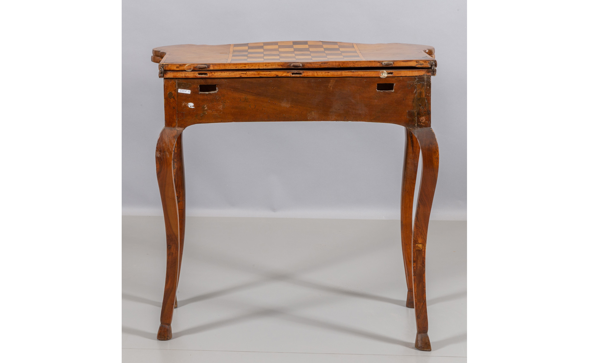 Tavolino da gioco in noce con piano apribile intarsiato sul piano con il gioco della dama Piemonte sec.XVIII