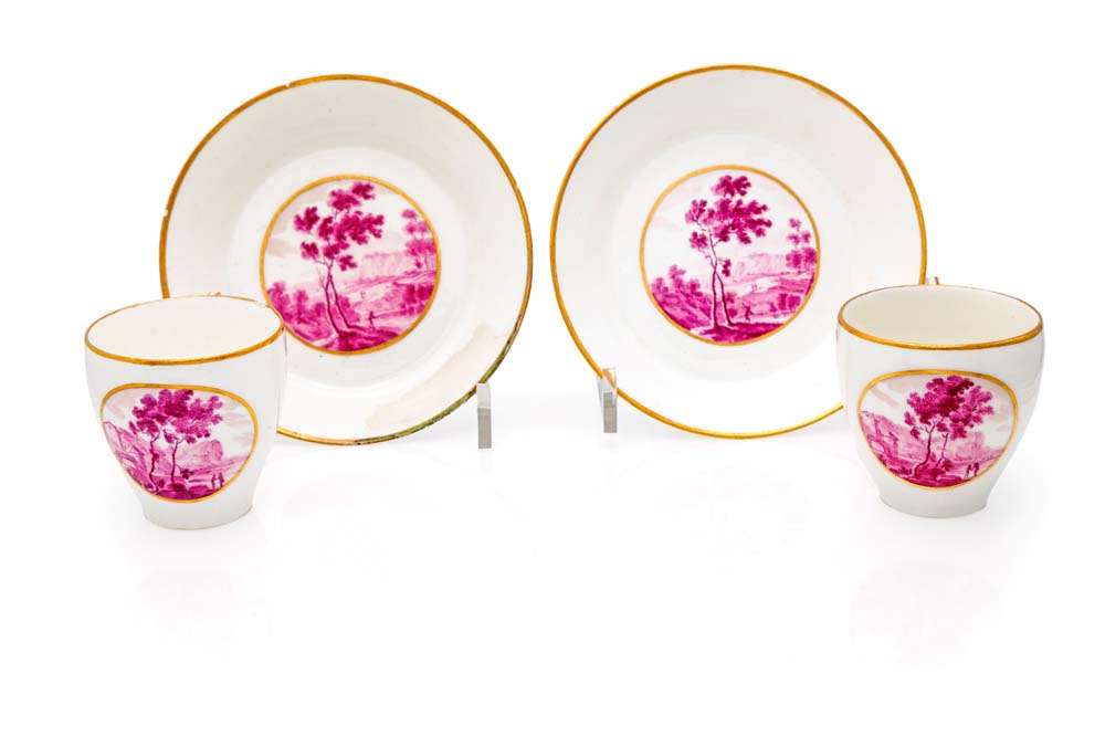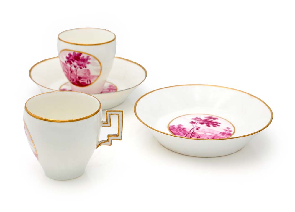 Coppia di tazzine con piattino in porcellana, Real Fabbrica Ferdinandea, Napoli, XIX secolo decorate da un paesaggio in monocromia porpora entro medaglione delineato in oro. Lievi difetti e restauri cm 6,3x8,2x6,4 - piattino diametro cm 13,2
