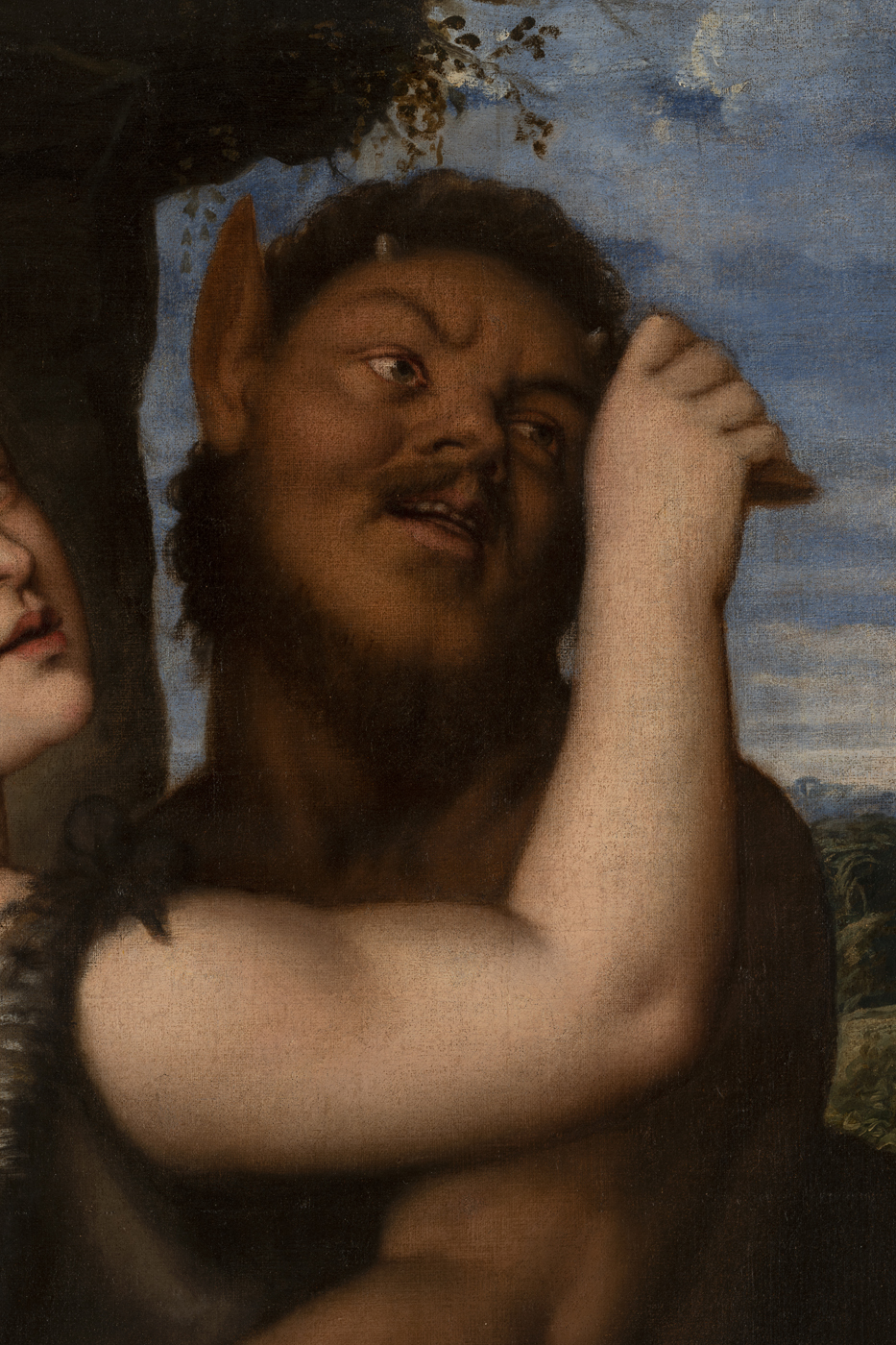 Sul piano materiale, l'ampio set di indagini ha rilevato non solo la piena coerenza con i materiali della bottega di Tiziano alla metà del Cinquecento, anche evidenziando il prezioso blu oltremare impiegato per il cielo, alternato a biadetto d'oltremare, ma anche importanti variazioni in corso di esecuzione sia della grotta (con un avanzamento del profilo delle rocce rispetto alla posizione originaria) sia delle due figure, in particolare con il riposizionamento e la accentuazione della rotazione del volto, la modifica della capigliatura, l'addizione del braccio retrostante e della pelliccia - di cui è stato disegnato e poi modificato il nodo - sulla figura della menade già conclusa, e significative modifiche del braccio, del satiro, che la avvinghia. Interessante anche il fresco disegno del volto, a carbone, sottostante la pittura.