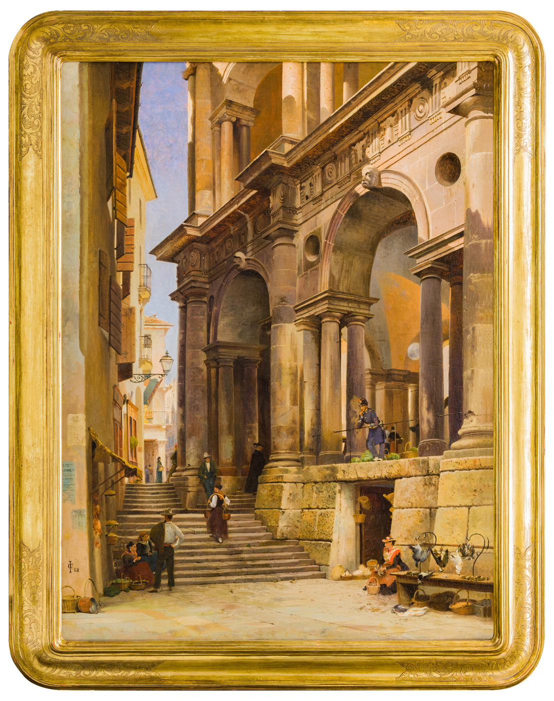 La veduta di Vicenza in asta, che mostra la basilica palladiana da Piazza delle Erbe verso Piazzetta Palladio, risale al 1882, come una veduta di Verona ad acquerello apparsa in asta a Christie's, Londra, il 10 dicembre 2014 (l. 713). Può quindi fungere da elemento di datazione del viaggio del pittore in Italia.