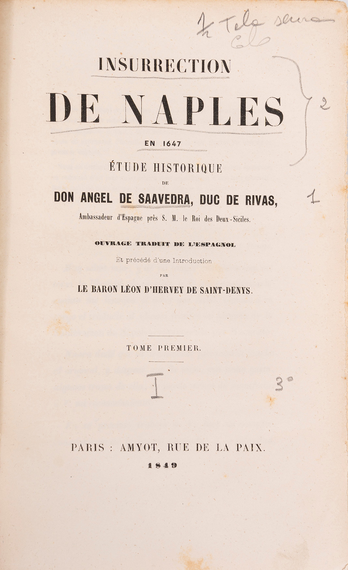 [Napoli, 1810 circa]. In 4°. Fioriture diffuse ma esemplare IN BARBE, legatura moderna in cartone rigido con titolo su tassello rosso al dorso. § Don Angel de Saavedra. Insurrection de Naples. Paris, Amyot, 1849. In 4°, due tomi. Esemplare in barbe, legatura moderna in piena tela marrone.
