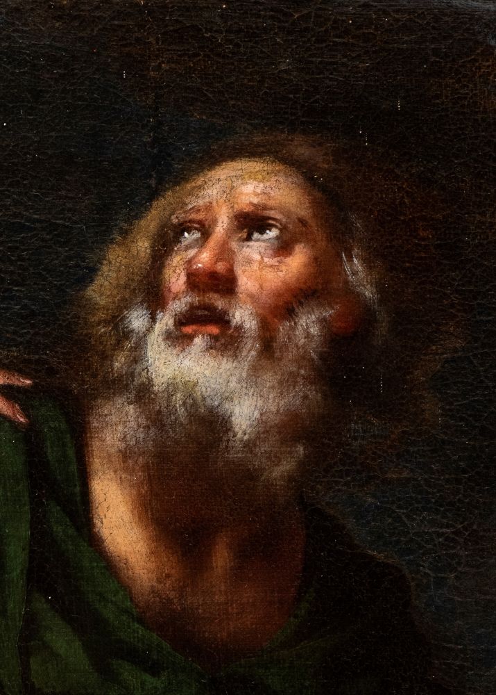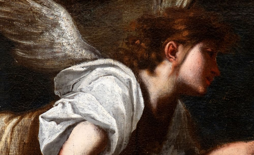 On the basis of stylistic and formal evidence, the work has been convincingly attributed to Francesco Furini by Professor Sandro Bellesi and Professor Elisa Acanfora. The composition presents an uncommon and deeply participatory interpretation of the theme: the angel intervenes not through forceful action, but by gently resting his hand on Abraham’s shoulder, underscoring the patriarch’s inner conflict between faith and paternal affection.