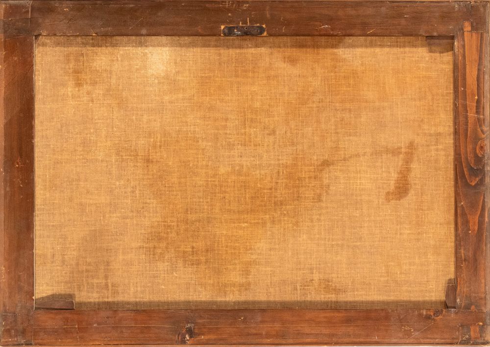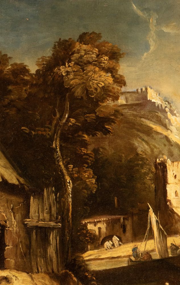 Landscape with stream, figures, and village Oil on canvas cm. 69x98. Framed The painting is accompanied by an expertise by Prof. Rodolfo Pallucchini. Private collection, Rome.