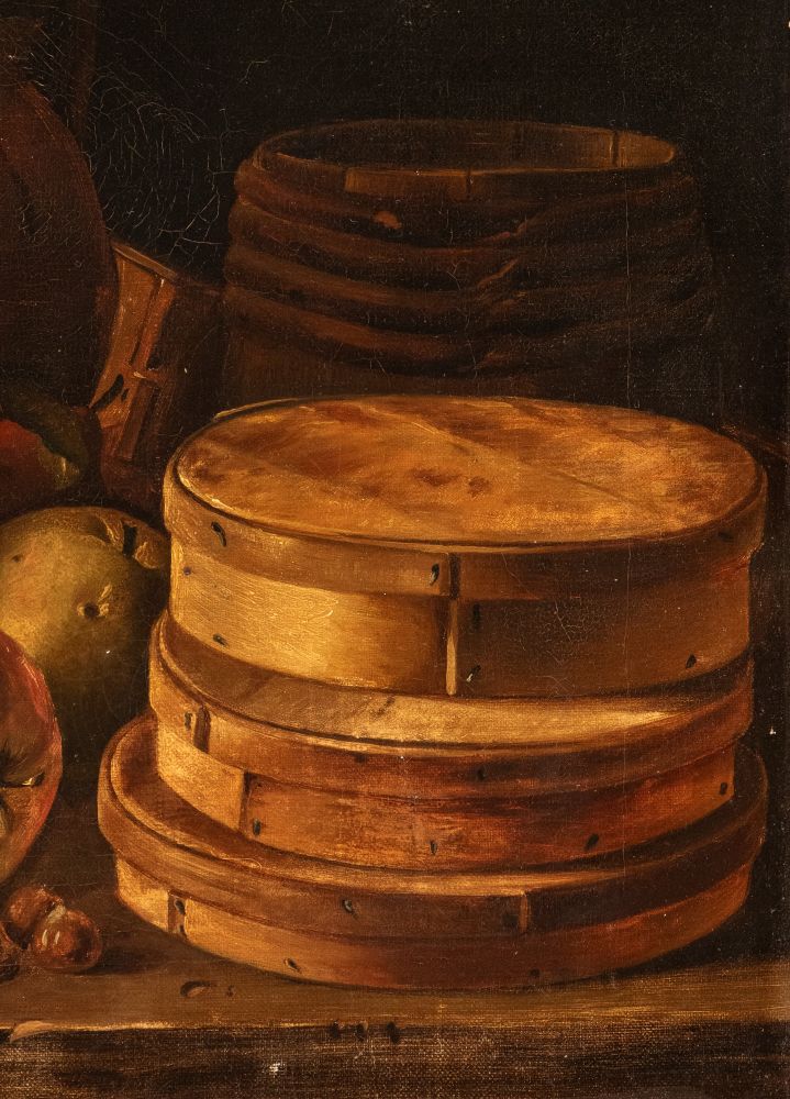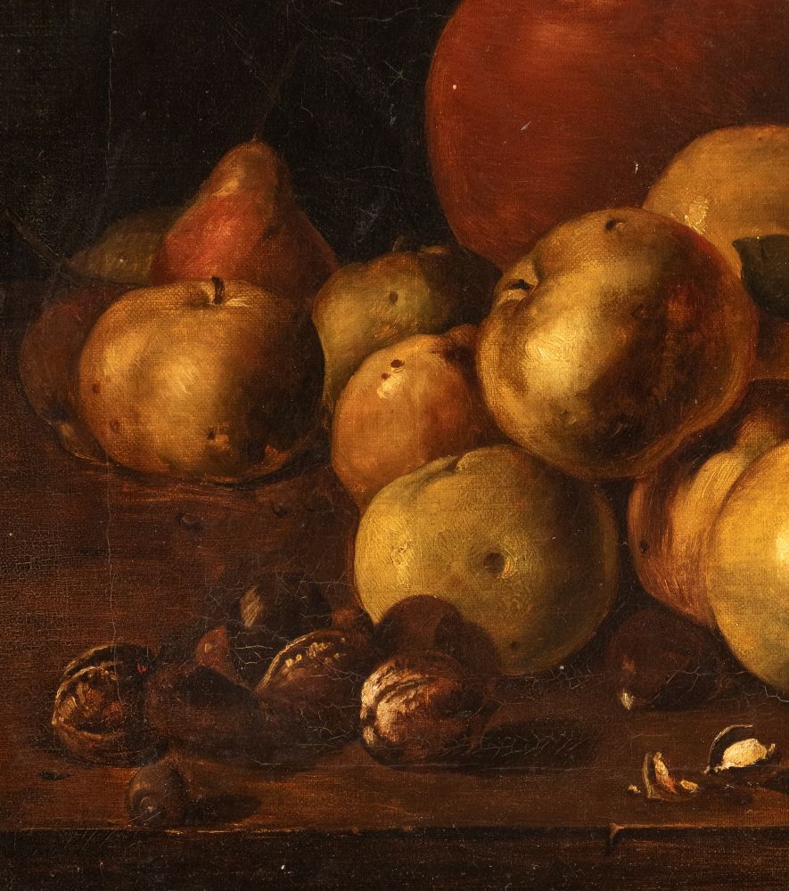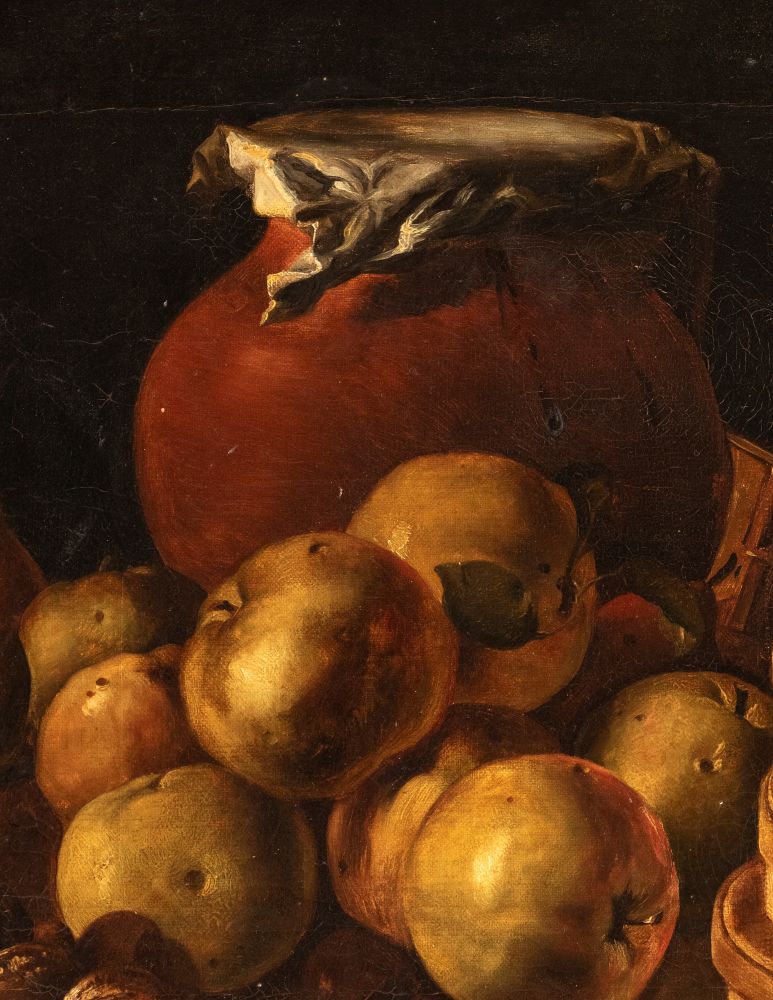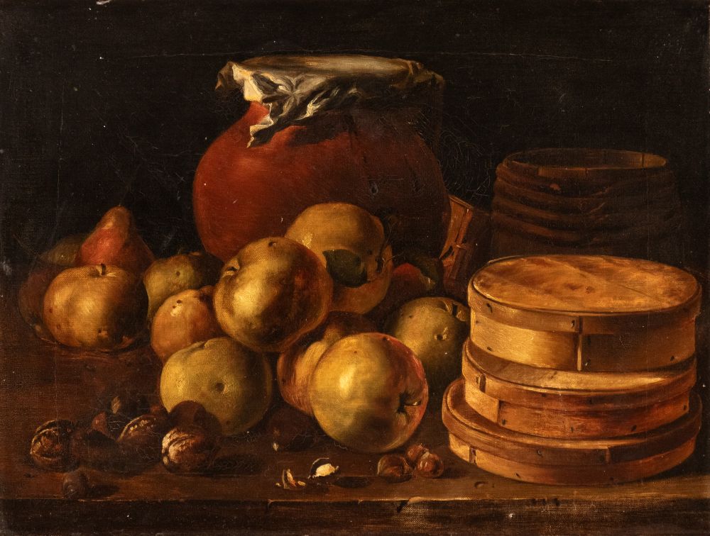 Still Life with apples, nuts, boxes of sweets and vessels Oil on canvas cm. 40x51,5. Framed The painting is a fine replica of the work by Luis Meléndez, now preserved in the Museo del Prado in Madrid.
