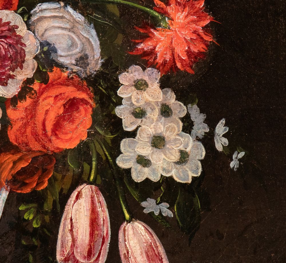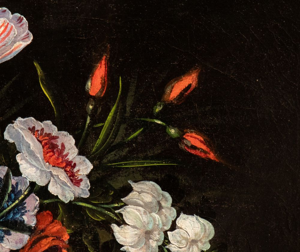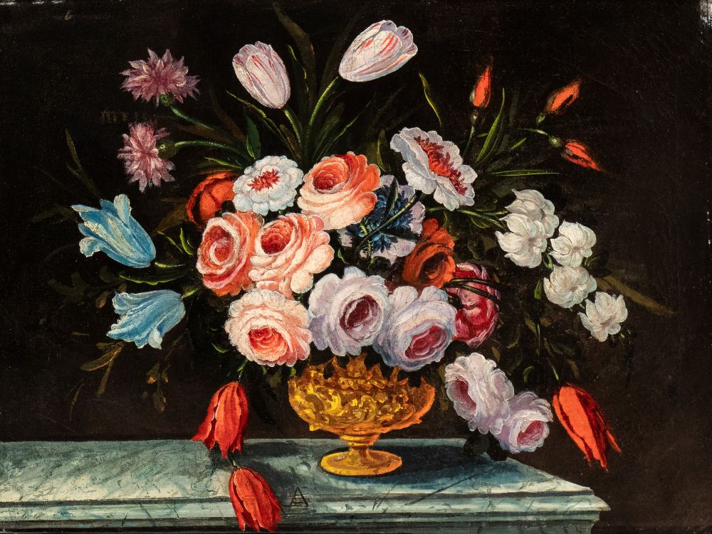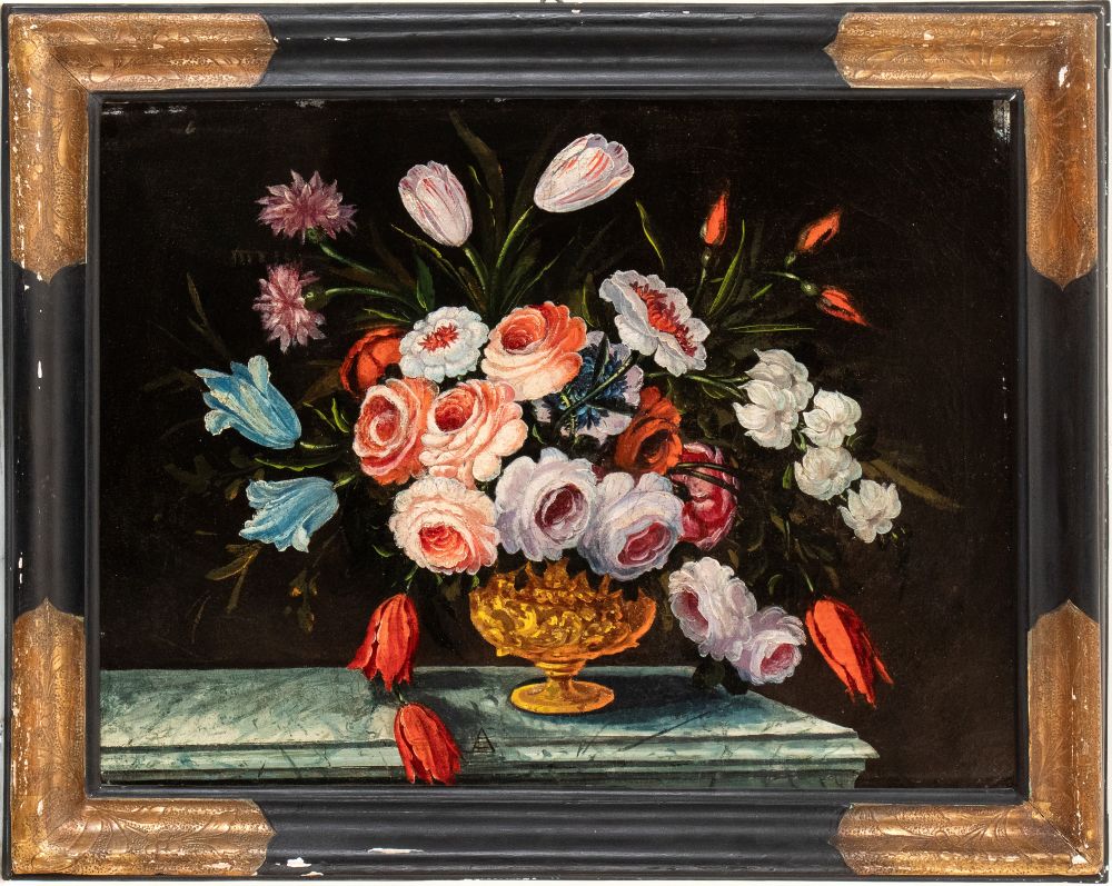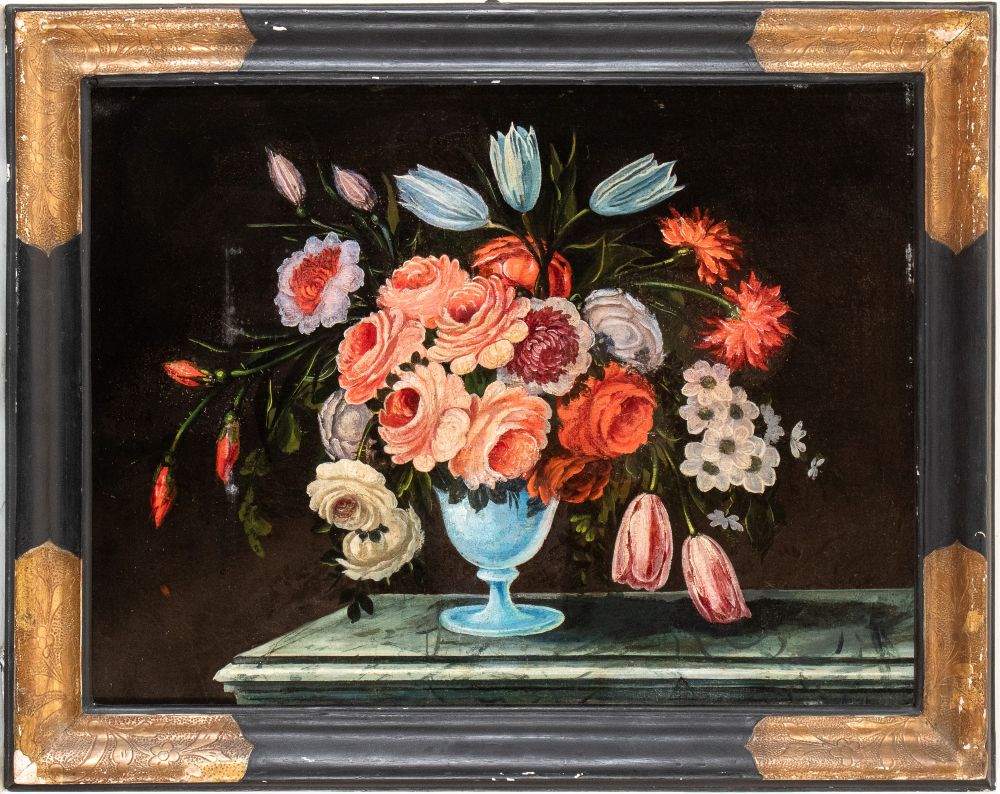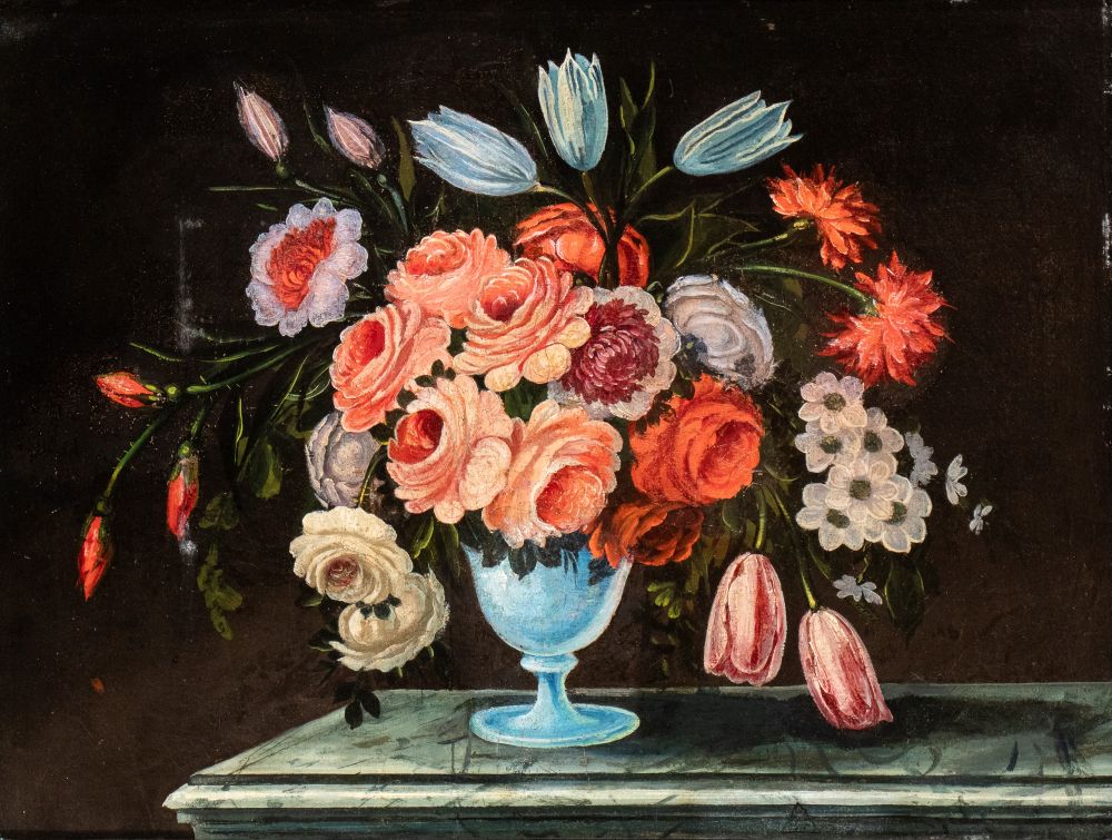 a) Bouquet of roses and tulips in a metal vase; b) Bouquet of roses and tulips in a glass vase. A pair of paintings Oil on canvas cm. 48,5x64,3 each. Framed