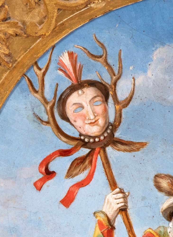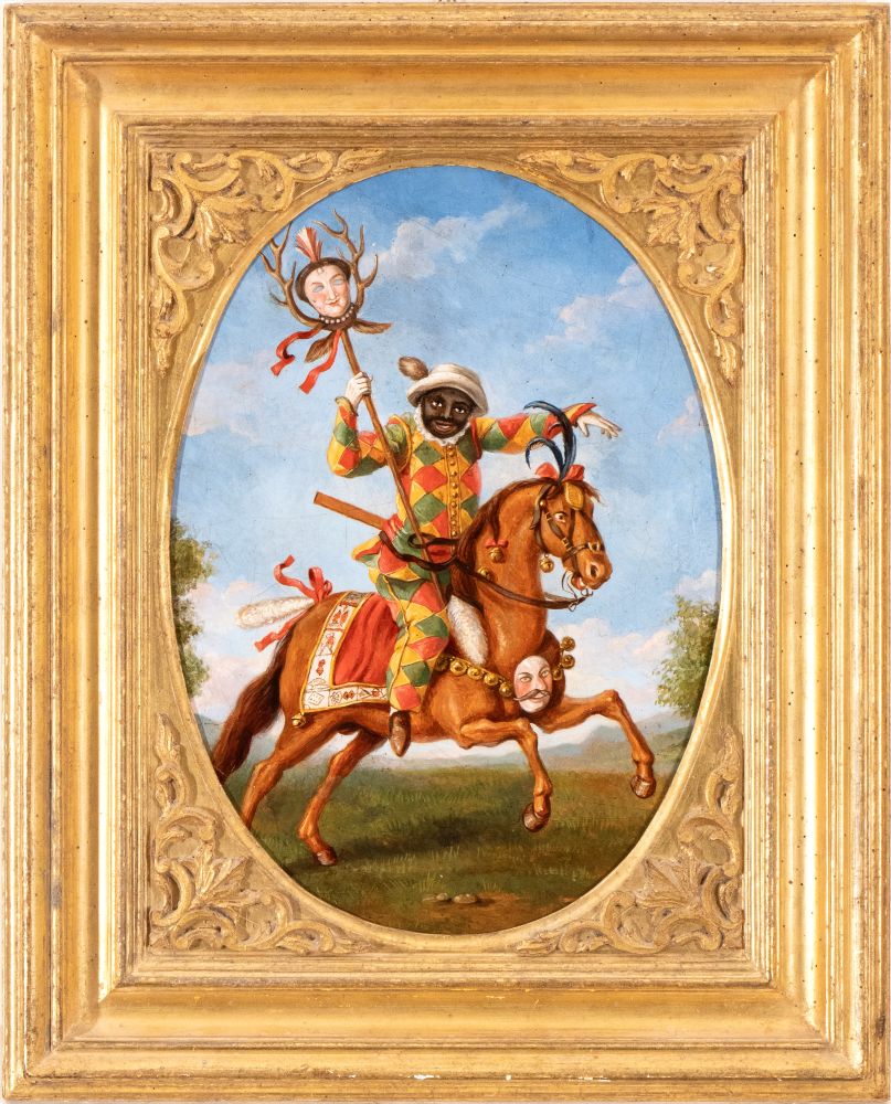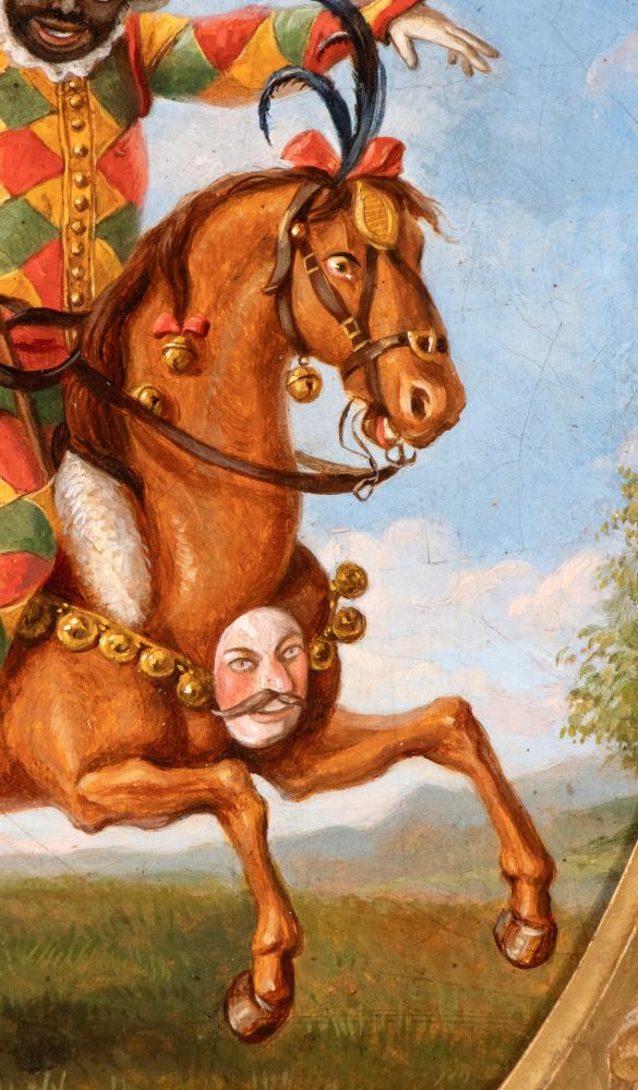 Harlequin on horseback Oil on canvas cm. 43,5x31. Framed After the etching Harlequin by Martin Engelbrecht, c. 1730, from a series of the principal Commedia dell’Arte masks on horseback.
