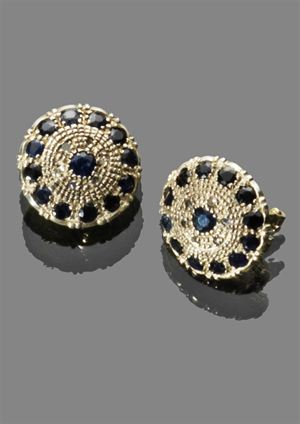 COPPIA DI ORECCHINI Coppia orecchini a clips in oro giallo e argento con zaffiri e diamanti taglio brillante Peso gr 11,00 Pair of clip earrings in yellow gold and silver with brillant cut diamonds and sapphires Weight 11.00 gr