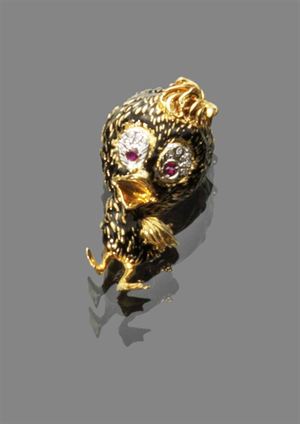 SPILLA Spilla in oro giallo e smalto con piccoli rubini e piccoli diamanti (raffigurante calimero) Peso gr 13,60 Yellow gold and enamel brooch with small rubies and small diamonds (representing calimero) Weight 13.60 gr
