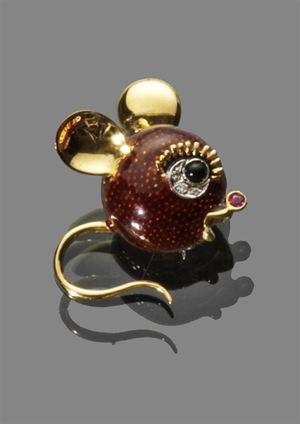 SPILLA Spilla in oro giallo e smalto a forma di topolino con piccoli diamanti taglio brillante e piccolo onice taglio cabochon Peso gr 13,10 Mouse shaped yellow gold and enamel brooch with small diamonds and a small onyx cabochon Weight 13.10 gr