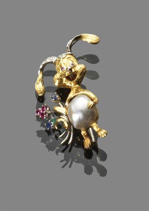 SPILLA Spilla in oro giallo e oro bianco a forma di coniglietto con perla grigia piccoli rubini, zaffiri e diamanti taglio 8/8 Peso gr 11,70 Banny shaped yellow and white gold brooch with gray pearl, small rubies, sapphires and diamond. Weight 11.70 gr
