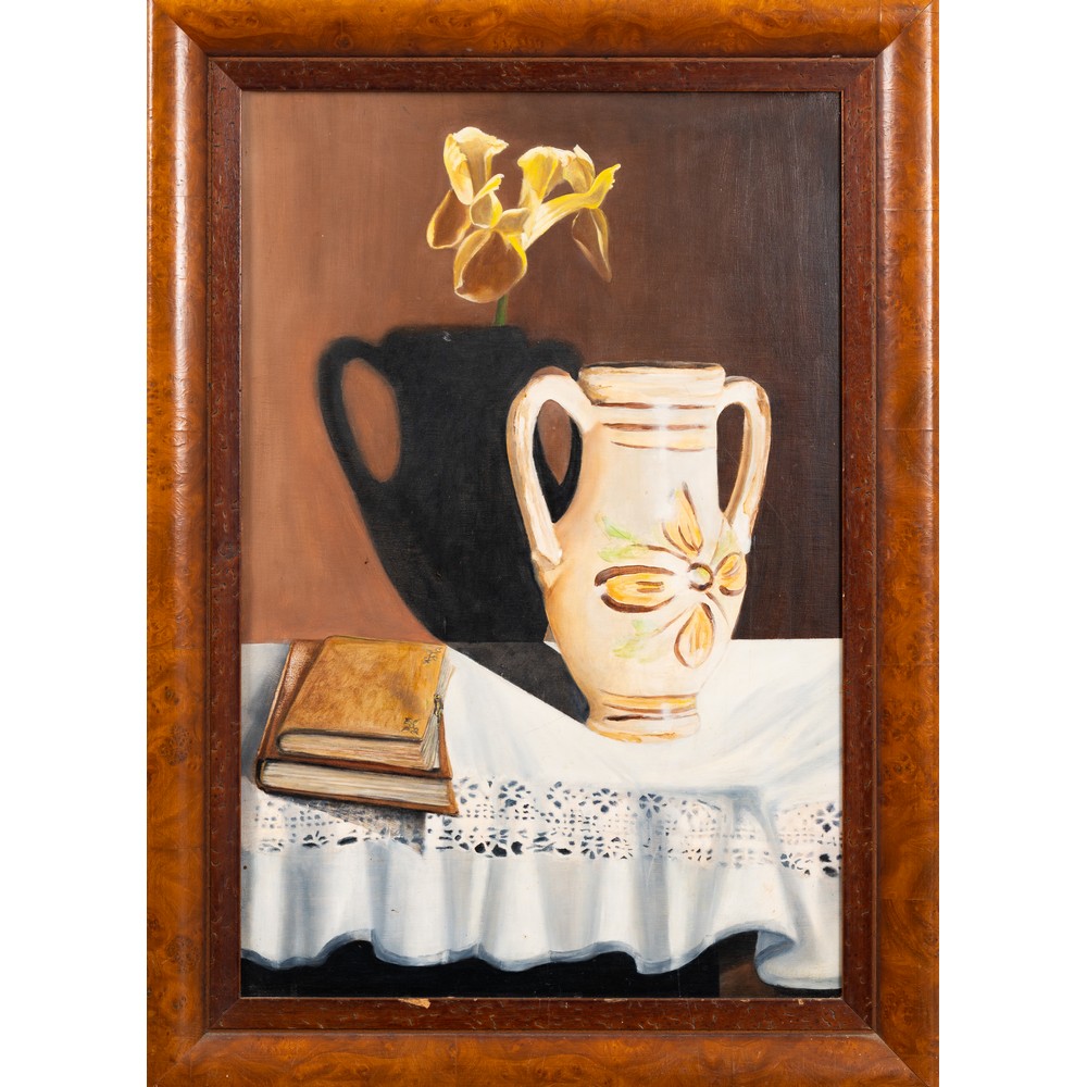 ANONIMO DEL XX SECOLO, Brocca e libri, Olio su tavola