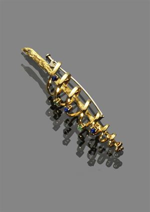 SPILLA Spilla in oro giallo con piccoli smeraldi e lapislazzoli Peso gr 11,00 Yellow gold brooch with emeralds and small lapis lazuli Weight 11.00 gr