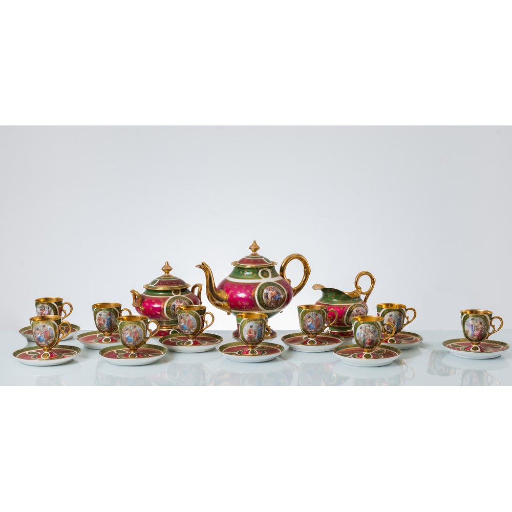 Servizio in porcellana decorata con lumeggiatura in oro composto da caffettiera, zuccheriera, lattiera e dieci tazzine con piattini raffiguranti "Soggetti mitologici"