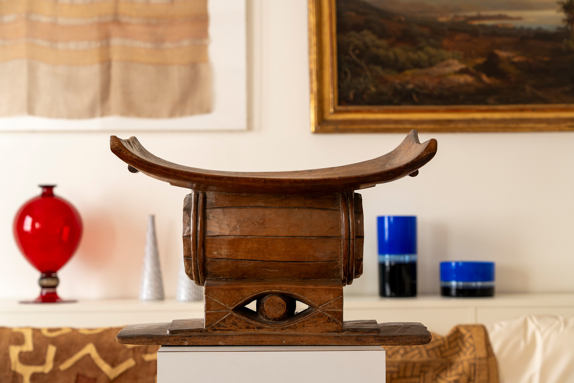 Il trono è un simbolo di prestigio che distingue i personaggi importanti del Regno Ashantiin legno dalla forma insolita che prevede una botte che sostiene la base di appoggio.