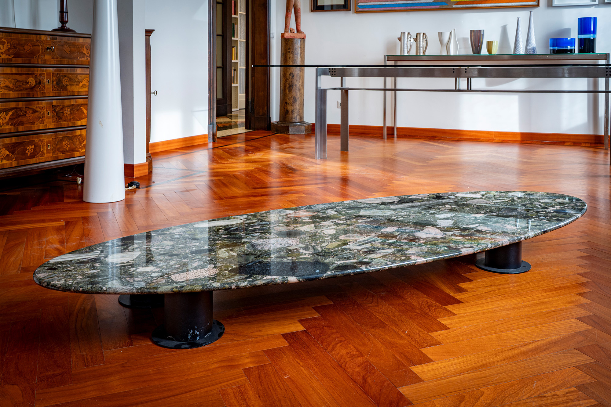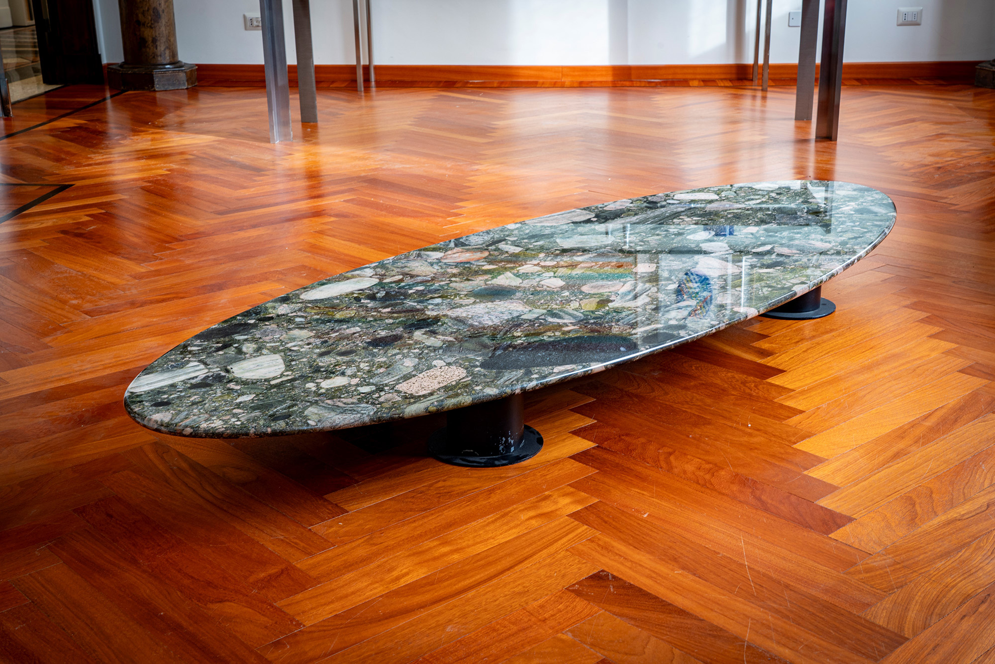Tavolo basso con piano in granito Verde Marinace e sostegni in metallo verniciato
