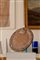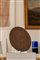 in legno di forma circolare a patina chiara con simboli in rilievo.