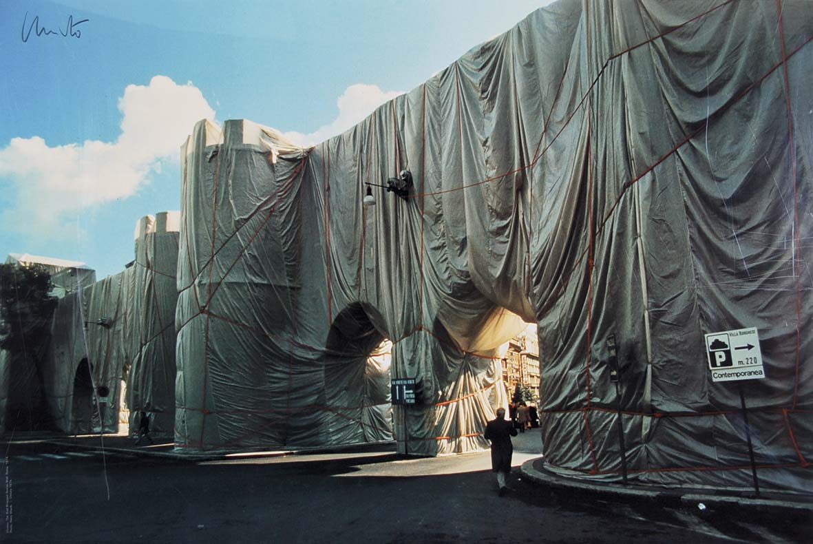 CHRISTO Gabrovo (Bulgaria) 1935 The Wall - Wrapped Roman Wall Rome 1974 stampa offset 64x95 cm firma in alto a sinistra, copyright Christo in basso