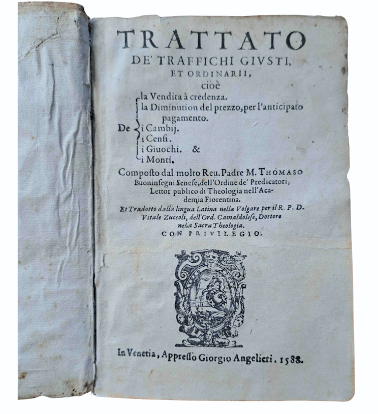 Prima edizione italiana di questa collezione di trattati riguardanti diversi aspetti dei rapporti commerciali, pubblicata precedentemente in latino nel 1587; i trattati sui tassi di cambio, sulle vendite a credito e scontate e sul gioco d'azzardo erano già stati pubblicati in italiano, i primi due nel 1573, gli altri nel 1585. L'autore condanna soprattutto l'eccessiva avidità di guadagno. Interessanti le parti riguardanti il rischio imprenditoriale e la sua difesa dell'utilità delle assicurazioni. Buoninsegni, domenicano nel Convento di S. Marco a Firenze, dopo gli studi all'Università di Perugia, fu a lungo docente di teologia all'Università di Firenze. Le sue opere riguardano in particolare la moralità dell'economia e della finanza.