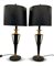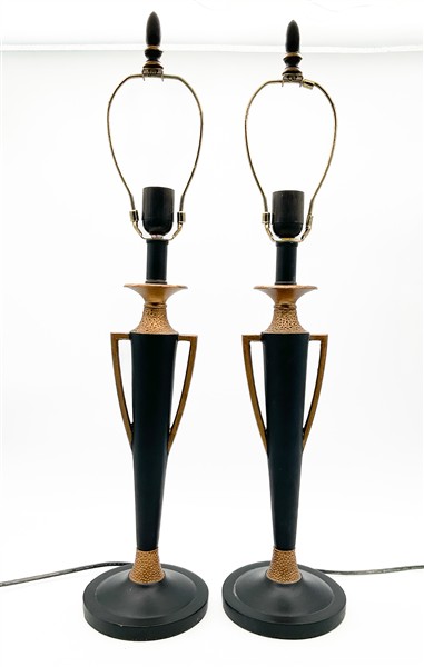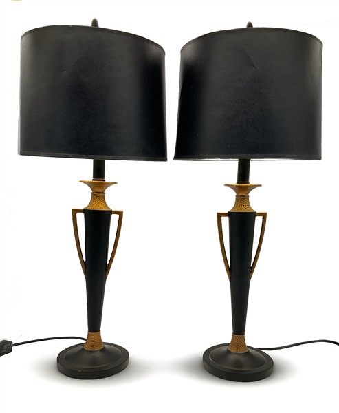 Coppia di lampade in metallo brunito e dorato a vaso biansato con paralume in cartoncino nero e interno dorato (h tot cm 72) (difetti)