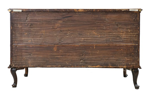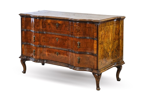 Cassettone di forma mossa lastronato in noce e radica di noce con filettature, fronte a tre cassetti e gambe mosse. Veneto, secolo XVIII (cm 144x90x65) (difetti, restauri e sostituzioni)
