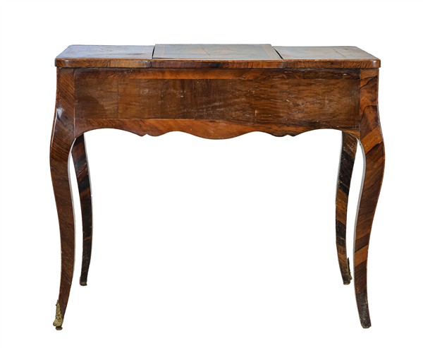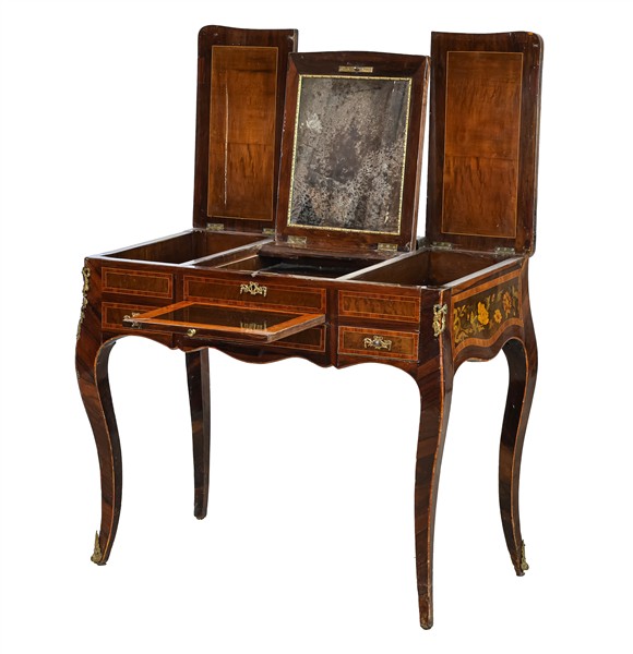 Toilette lastronata e intarsiata in legni vari a motivi floreali, piano tripartito e ribaltabile celante specchio, fronte con due tiretti e tablette estraibile, gambe mosse. Secolo XIX (cm 88x72x49) (difetti)